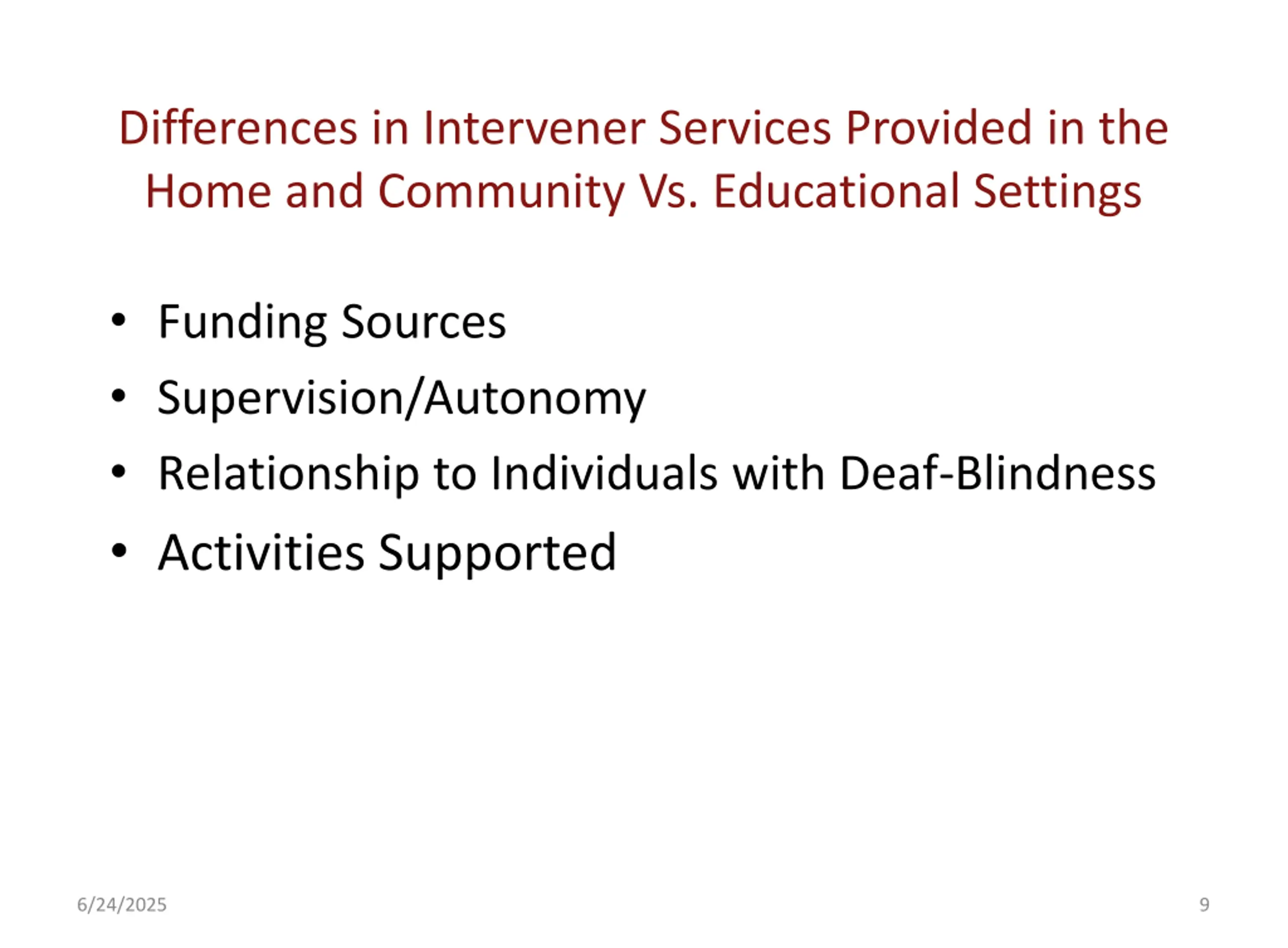 Differences in Intervener Services Provided in the Home and Community Vs. Educational Settings Funding Sources Supervision/Autonomy Relationship to Individuals with Deaf-Blindness Activities Supported 6/24/2025 9