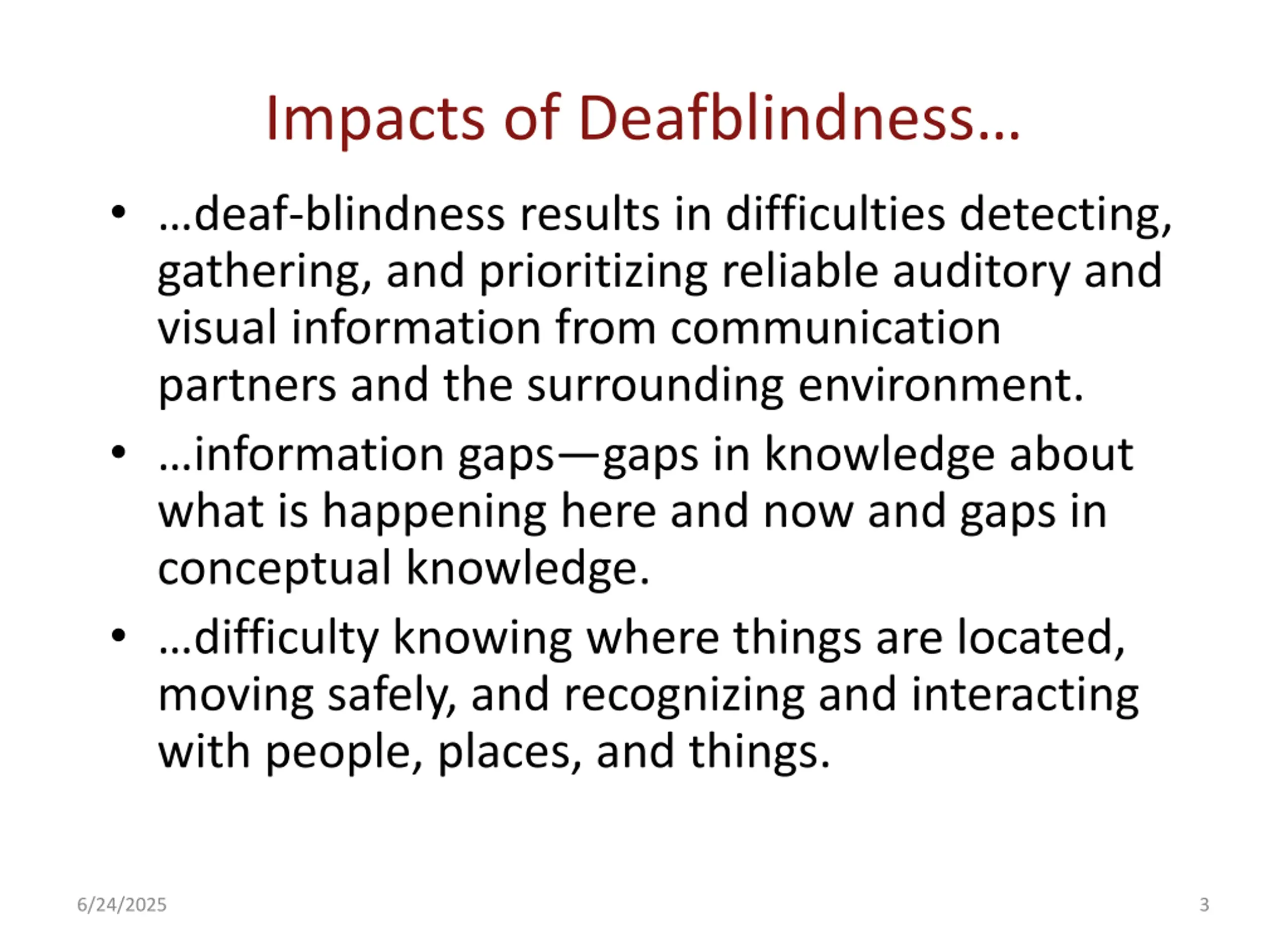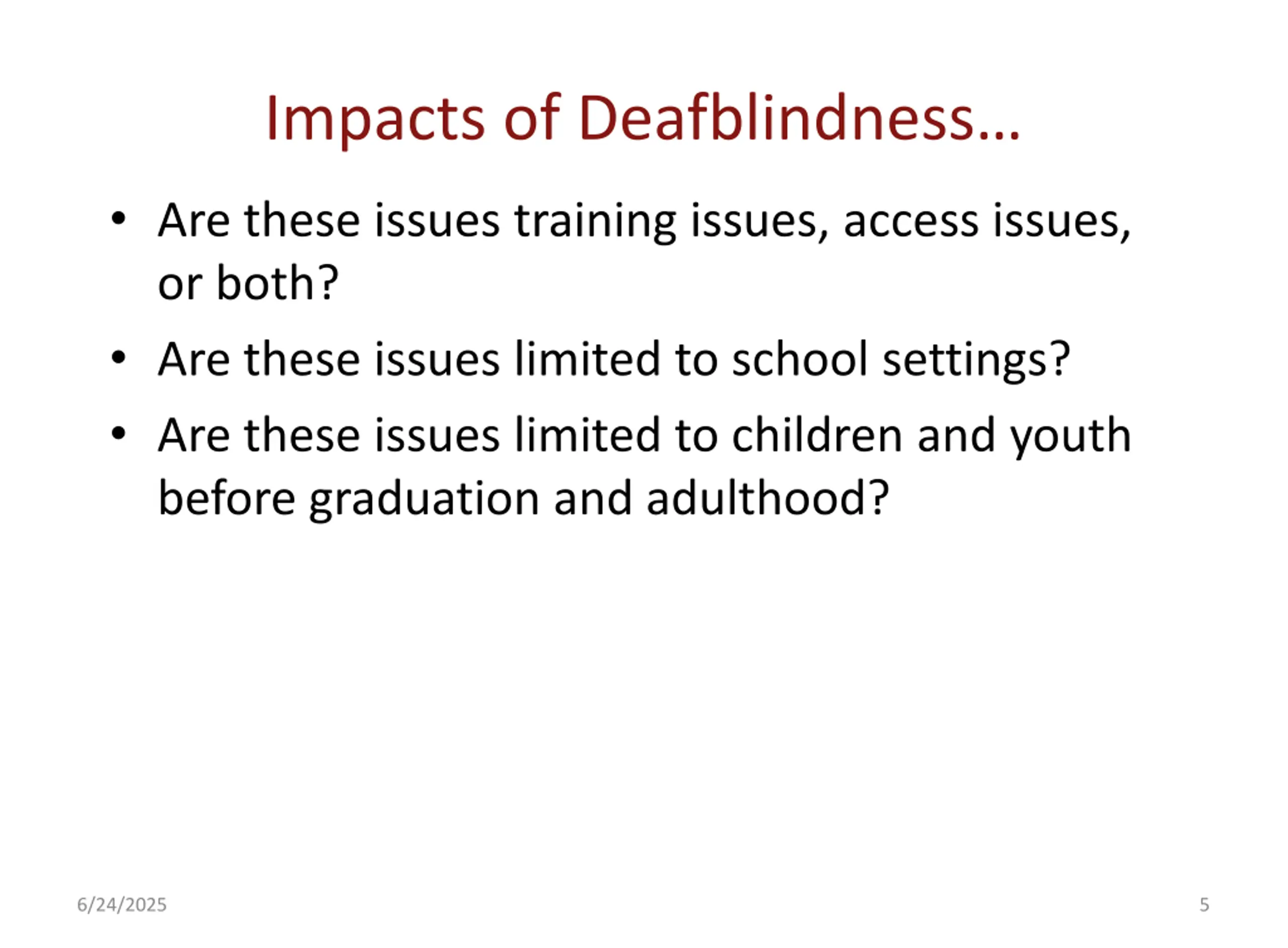 Impacts of Deafblindness Are these issues training issues, access issues, or both? Are these issues limited to school settings? Are these issues limited to children and youth before graduation and adulthood? 6/24/2025 5