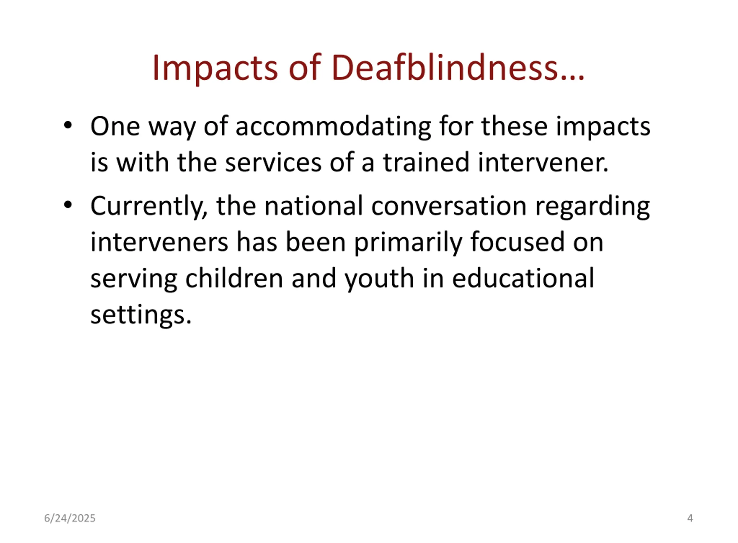 Impacts of Deafblindness One way of accommodating for these impacts is with the services of a trained intervener. Currently, the national conversation regarding interveners has been primarily focused on serving children and youth in educational settings. 6/24/2025 4