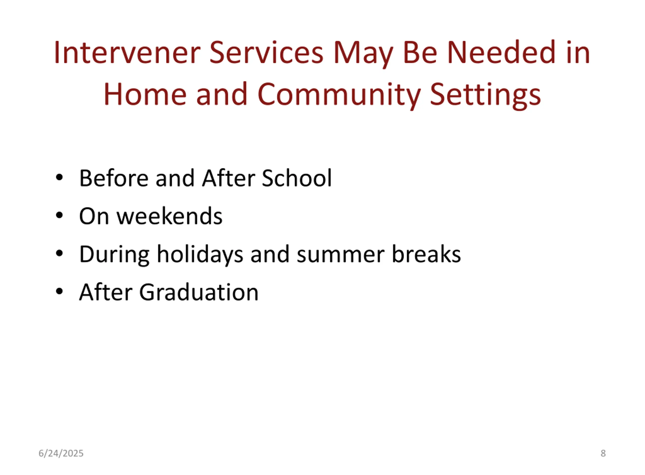 Intervener Services May Be Needed in Home and Community Settings Before and After School On weekends During holidays and summer breaks After Graduation 6/24/2025 8