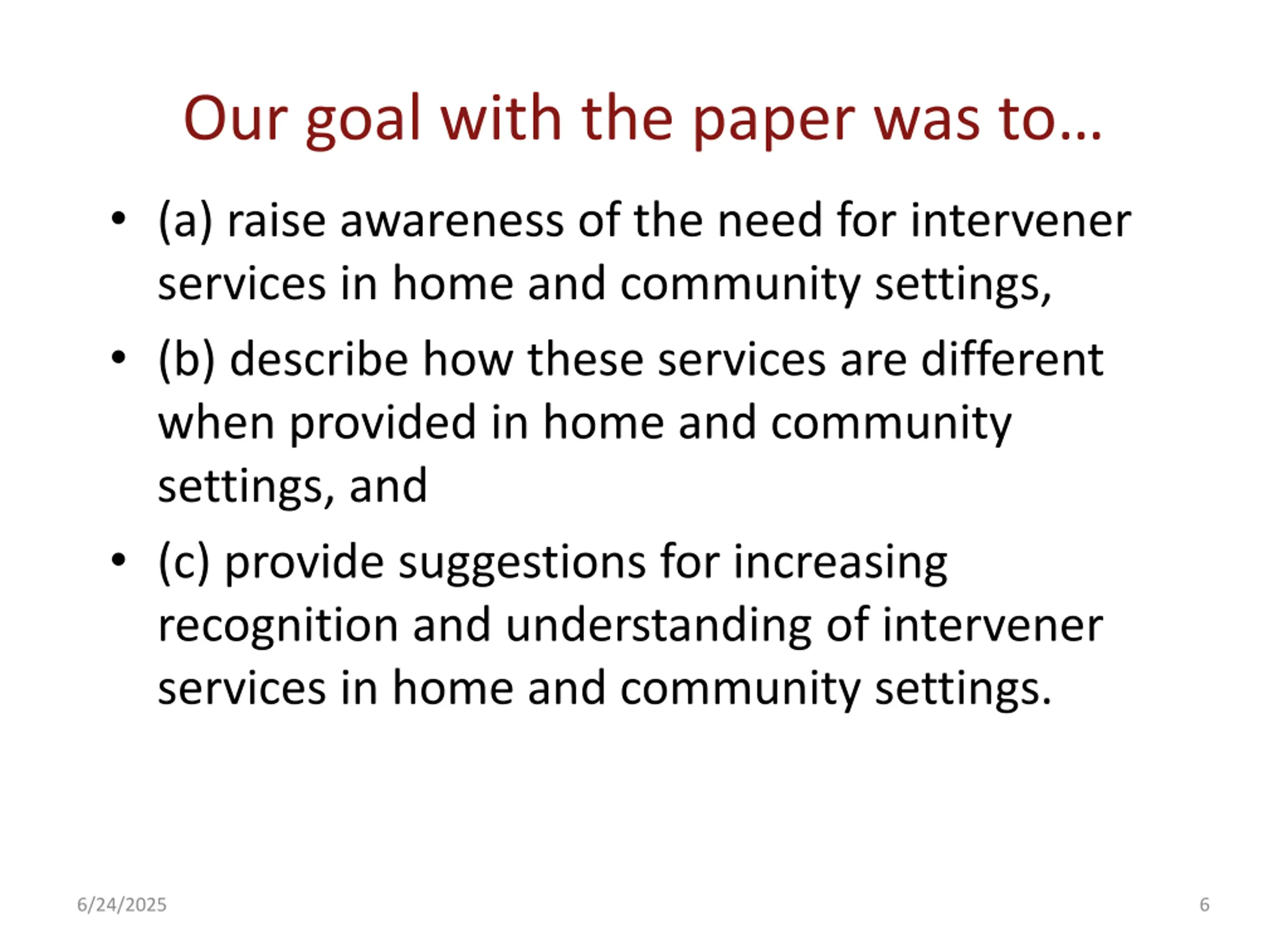 Our goal with the paper was to (a) raise awareness of the need for intervener services in home and community settings, (b) describe how these services are different when provided in home and community settings, and (c) provide suggestions for increasing recognition and understanding of intervener services in home and community settings. 6/24/2025 6