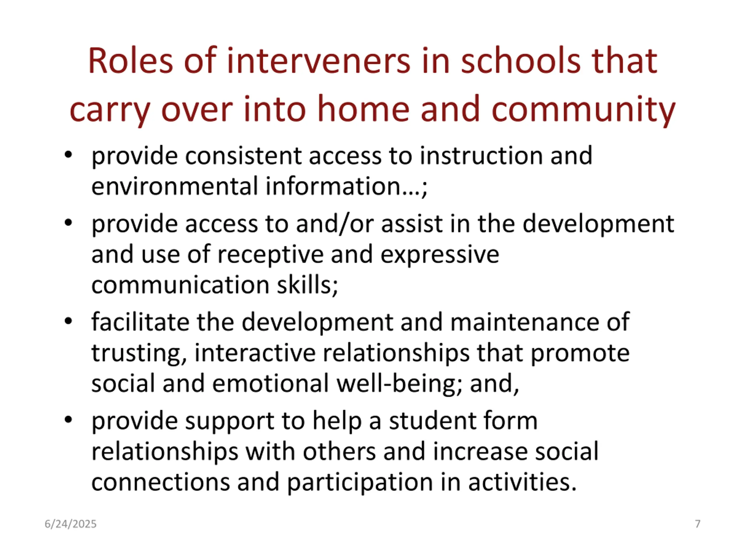 Roles of interveners in schools that carry over into home and community provide consistent access to instruction and environmental information ; provide access to and/or assist in the development and use of receptive and expressive communication skills; facilitate the development and maintenance of trusting, interactive relationships that promote social and emotional well-being; and, provide support to help a student form relationships with others and increase social connections and participation in activities. 6/24/2025 7