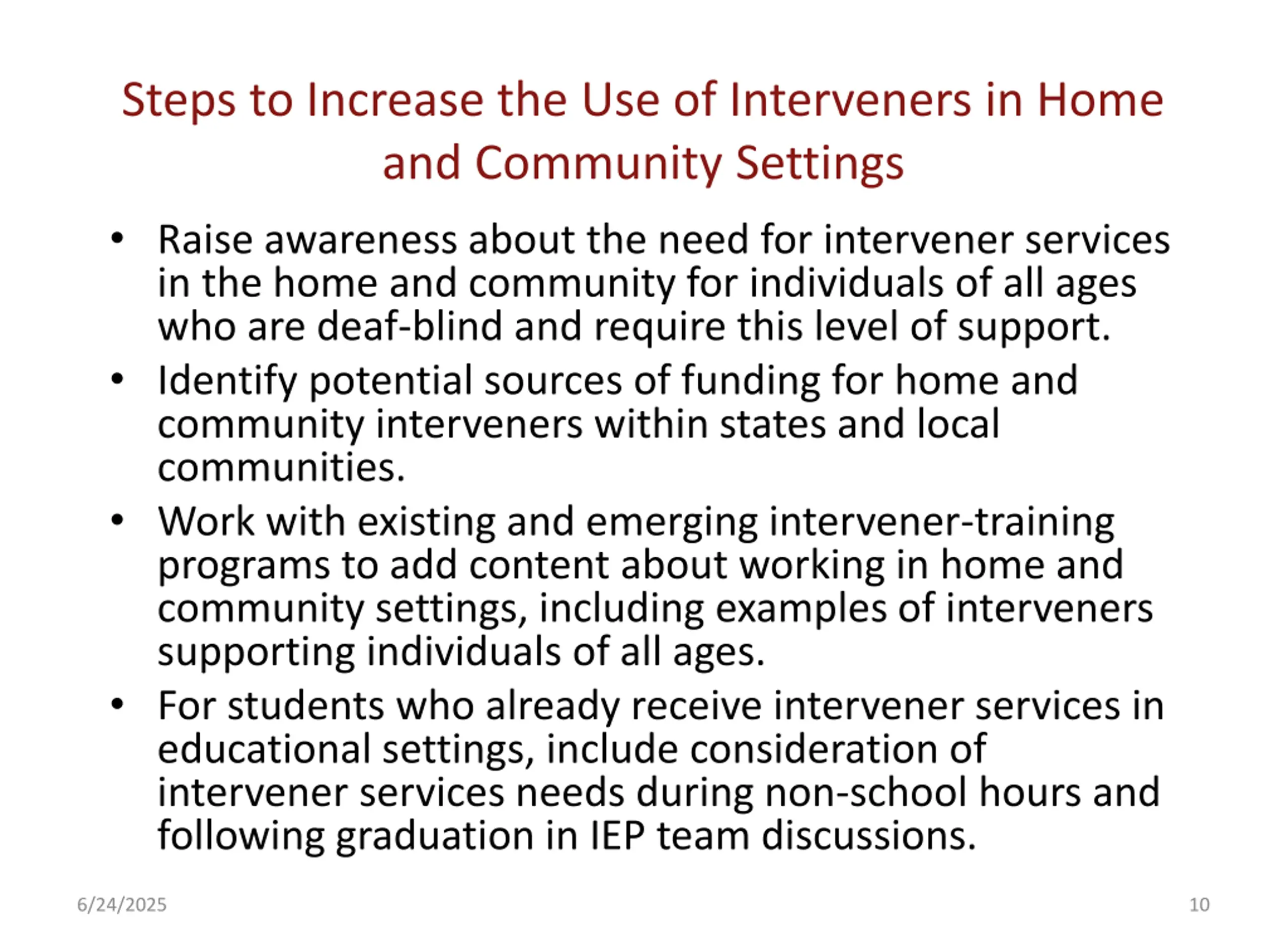 Steps to Increase the Use of Interveners in Home and Community Settings Raise awareness about the need for intervener services in the home and community for individuals of all ages who are deaf-blind and require this level of support. Identify potential sources of funding for home and community interveners within states and local communities. Work with existing and emerging intervener-training programs to add content about working in home and community settings, including examples of interveners supporting individuals of all ages. For students who already receive intervener services in educational settings, include consideration of intervener services needs during non-school hours and following graduation in IEP team discussions. 6/24/2025 10