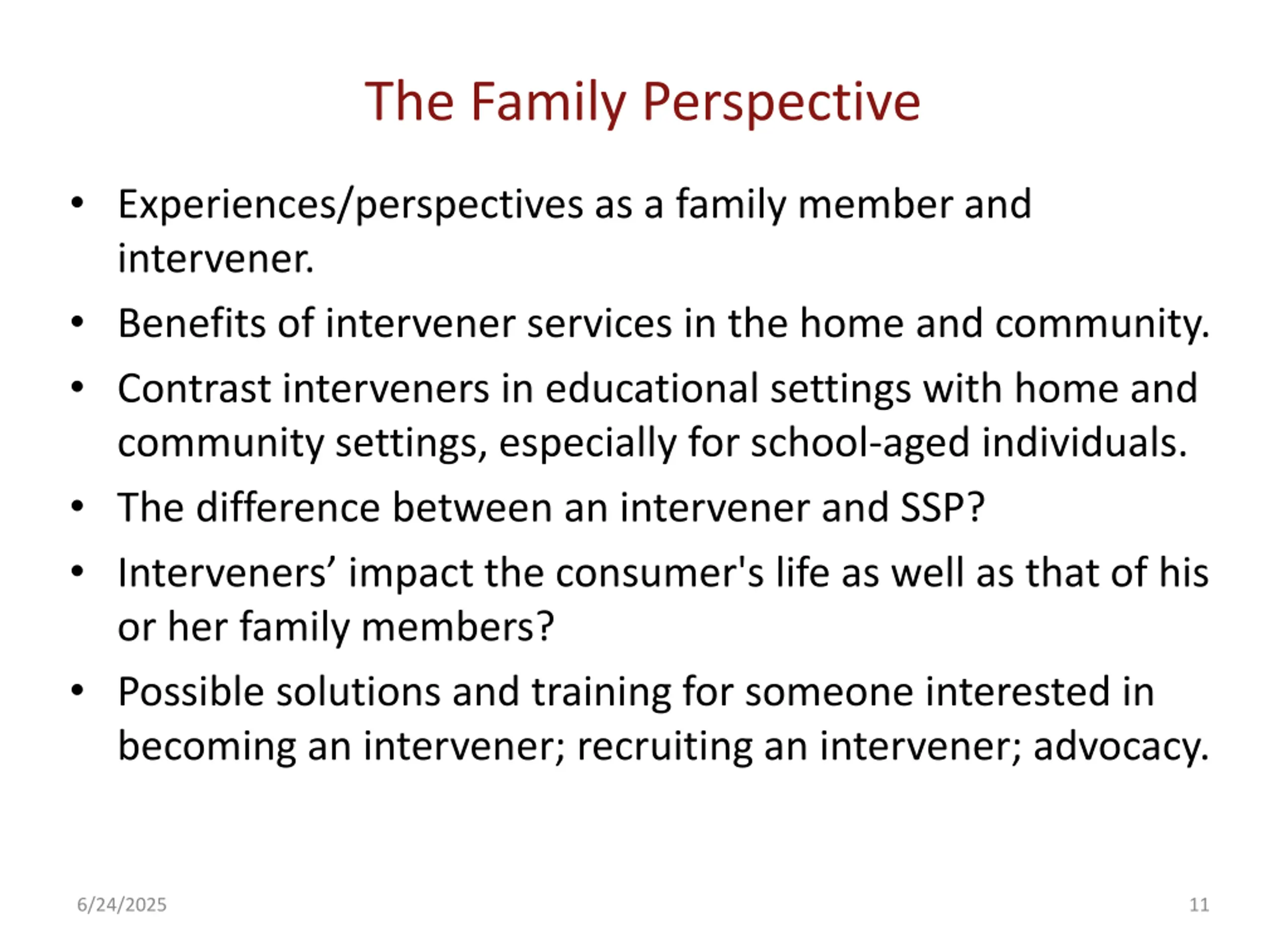 The Family Perspective Experiences/perspectives as a family member and intervener. Benefits of intervener services in the home and community. Contrast interveners in educational settings with home and community settings, especially for school-aged individuals. The difference between an intervener and SSP? Interveners impact the consumer's life as well as that of his or her family members? Possible solutions and training for someone interested in becoming an intervener; recruiting an intervener; advocacy. 6/24/2025 11