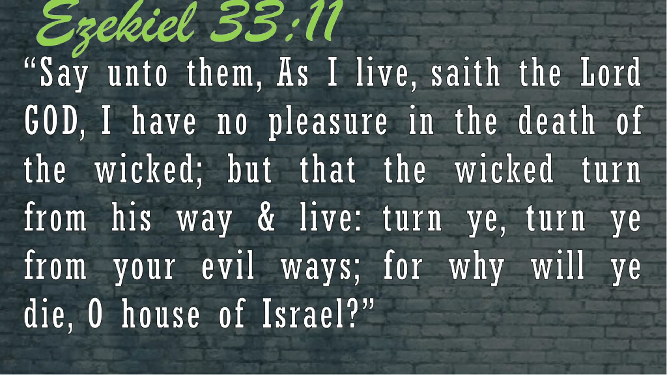 Ezekiel 33:11 Say unto them, As I live, saith the Lord GOD, I have no pleasure in the death of the wicked; but that the wicked turn from his way & live: turn ye, turn ye from your evil ways; for why will ye die, O house of Israel?