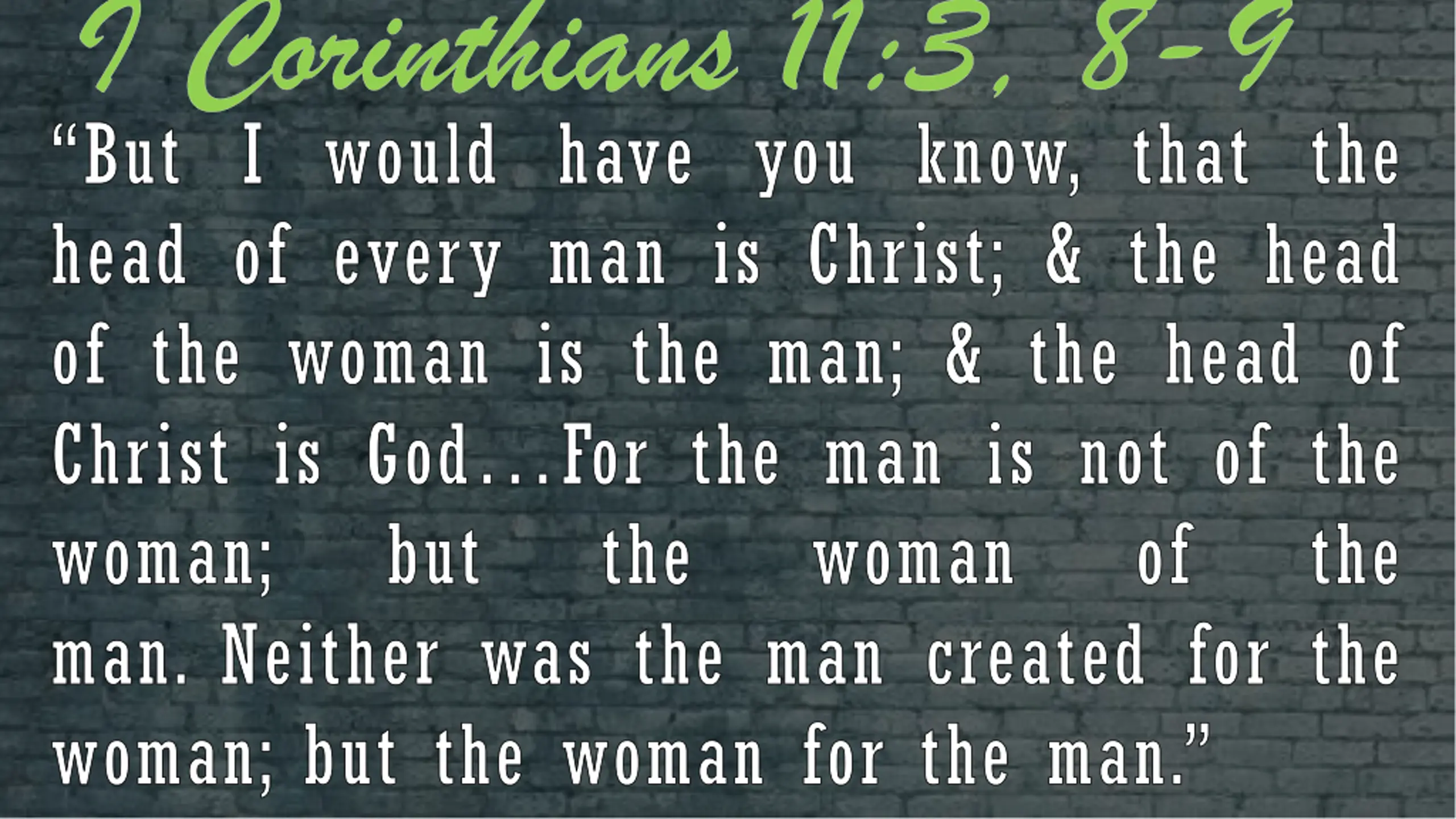 I Corinthians 11:3, 8-9 But I would have you know, that the head of every man is Christ; & the head of the woman is the man; & the head of Christ is God For the man is not of the woman; but the man. Neither was the man created for the woman; but the woman for the man. woman of the