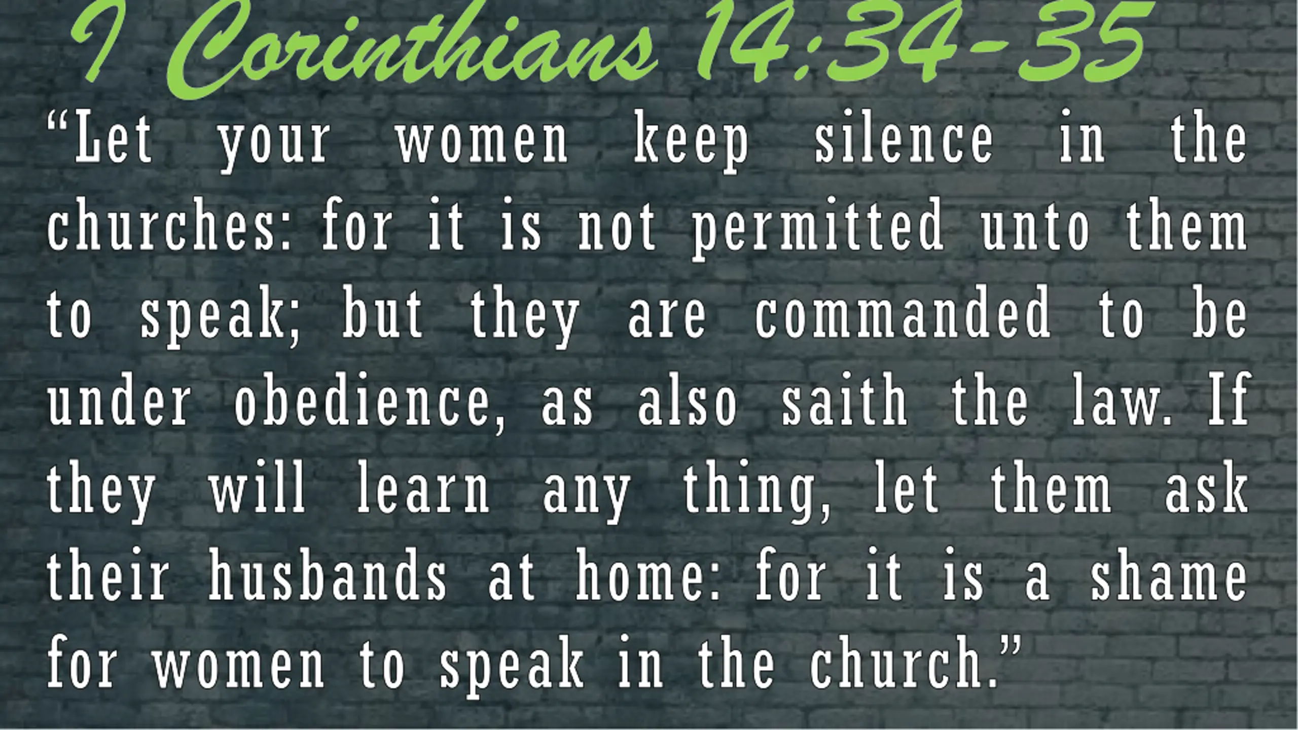 I Corinthians 14:34-35 Let your women keep silence in the churches: for it is not permitted unto them to speak; but they are commanded to be under obedience, as also saith the law. If they will learn any thing, let them ask their husbands at home: for it is a shame for women to speak in the church.