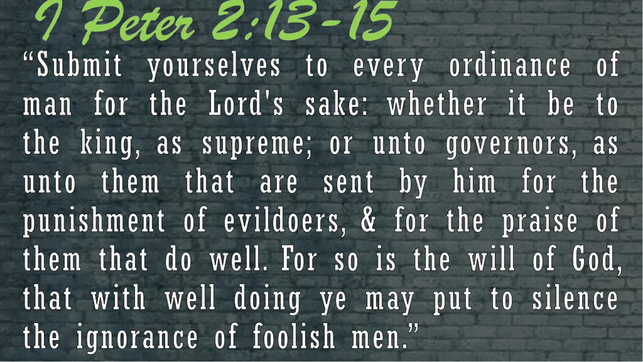 I Peter 2:13-15 Submit yourselves to every ordinance of man for the Lord's sake: whether it be to the king, as supreme; or unto governors, as unto them that are sent by him for the punishment of evildoers, & for the praise of them that do well. For so is the will of God, that with well doing ye may put to silence the ignorance of foolish men.