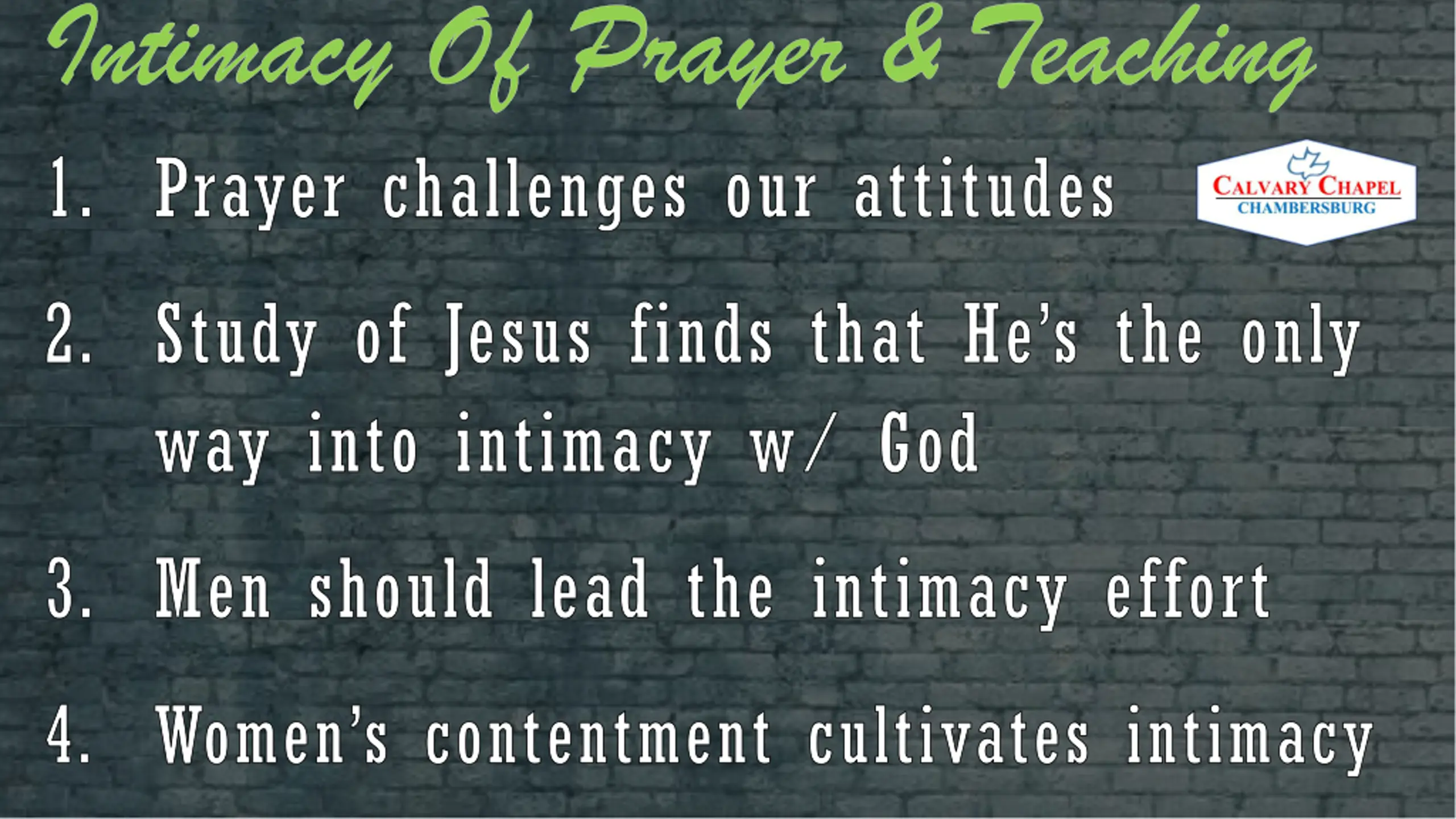 Intimacy Of Prayer & Teaching Prayer challenges our attitudes Study of Jesus finds that He s the only way into intimacy w/ God Men should lead the intimacy effort Women s contentment cultivates intimacy