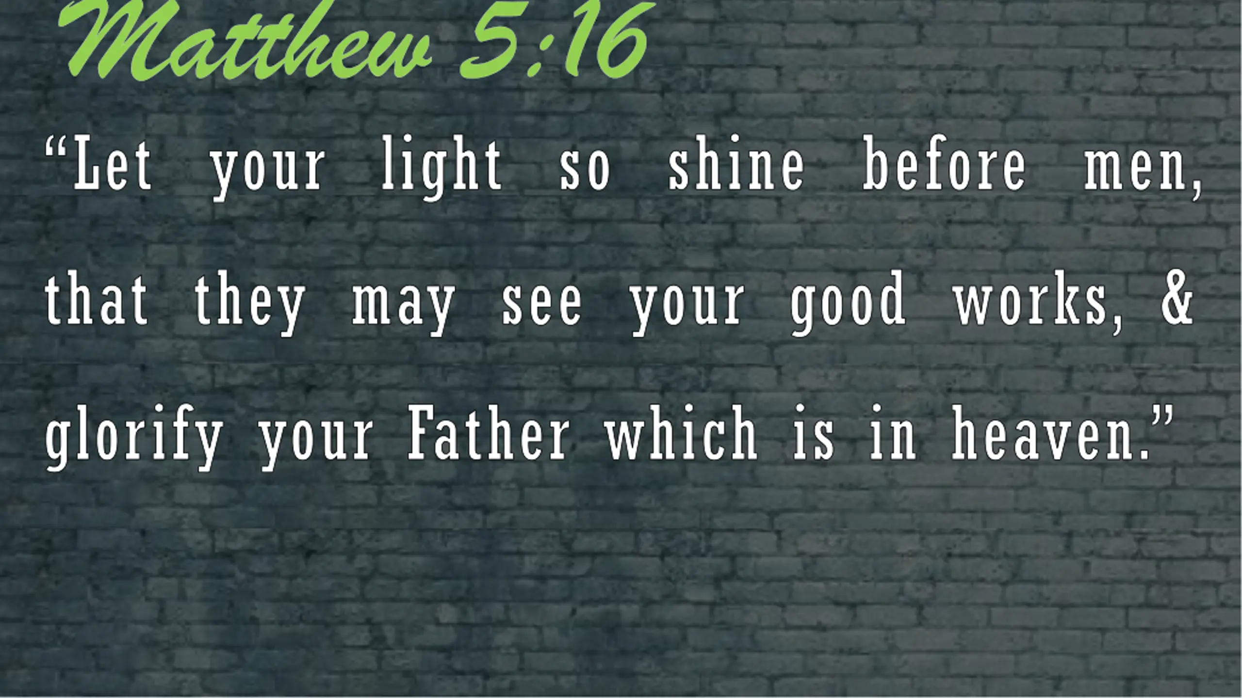 Matthew 5:16 Let your light so shine before men, that they may see your good works, & glorify your Father which is in heaven.