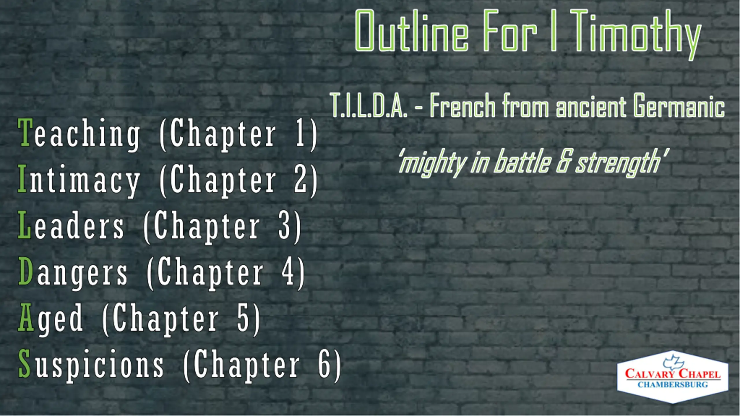 Outline For I Timothy T.I.L.D.A. -French from ancient Germanic Teaching (Chapter 1) Intimacy (Chapter 2) Leaders (Chapter 3) Dangers (Chapter 4) Aged (Chapter 5) Suspicions (Chapter 6) mighty in battle & strength
