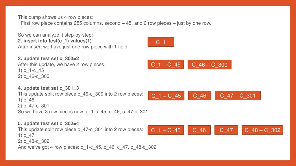 This dump shows us 4 row pieces: First row piece contains 255 columns, second 45, and 2 row pieces just by one row. So we can analyze it step-by-step: 2. insert into test(c_1) values(1) After insert we have just one row piece with 1 field. C_1 3. update test set c_300=2 After this update, we have 2 row pieces: 1) c_1-c_45 2) c_46-c_300 C_1 C_45 C_46 C_300 4. update test set c_301=3 This update split row piece c_46-c_300 into 2 row pieces: 1) c_46 2) c_47-c_301 So we have 3 row pieces now: c_1-c_45, c_46, c_47-c_301 C_46 C_47 C_301 C_1 C_45 5. update test set c_302=4 This update split row piece c_47-c_301 into 2 row pieces: 1) c_47 2) c_48-c_302 And we ve got 4 row pieces: c_1-c_45, c_46, c_47, c_48-c_302 C_46 C_47 C_48 C_302 C_1 C_45
