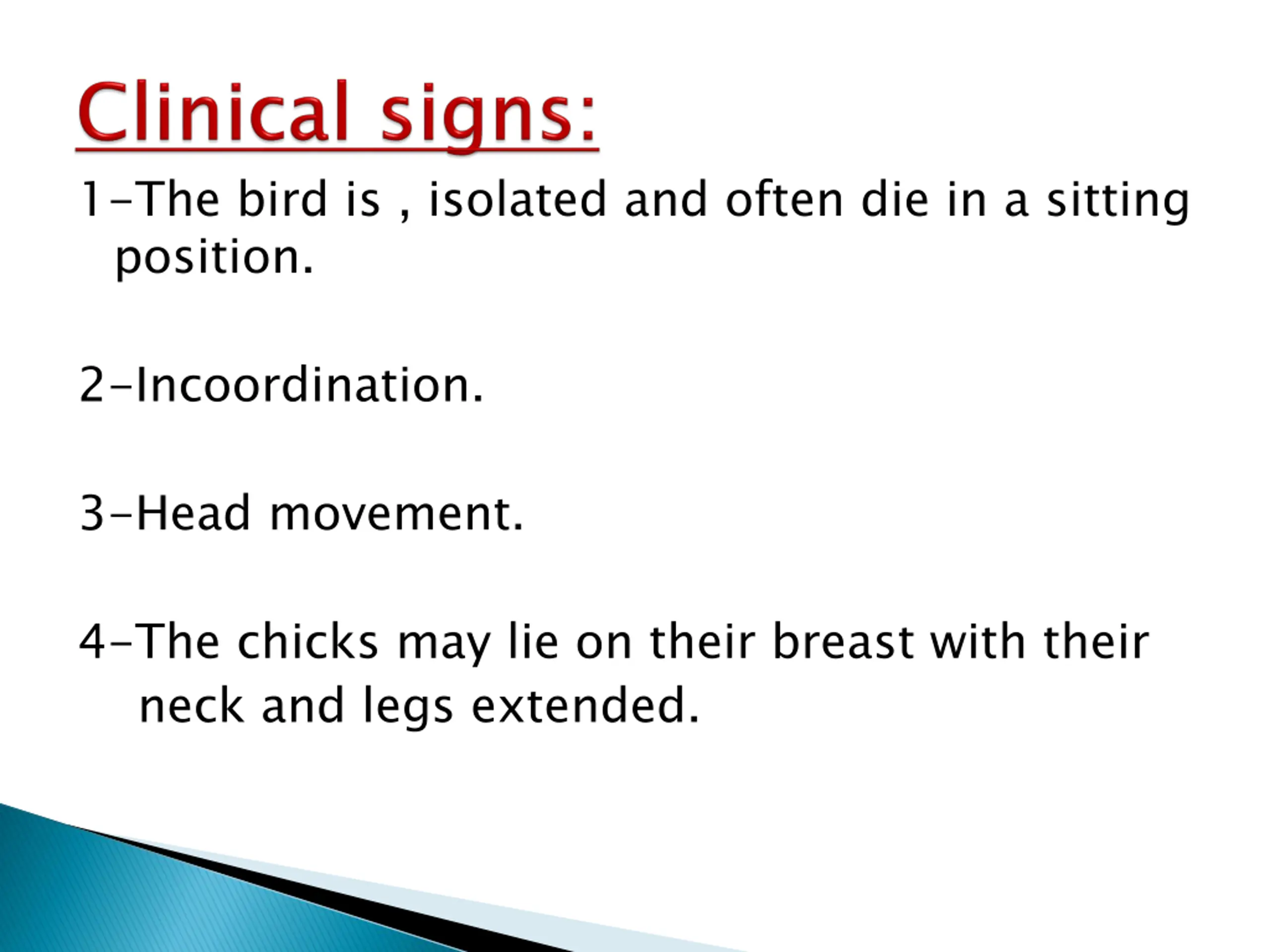 1-The bird is , isolated and often die in a sitting position. 2-Incoordination. 3-Head movement. 4-The chicks may lie on their breast with their neck and legs extended.