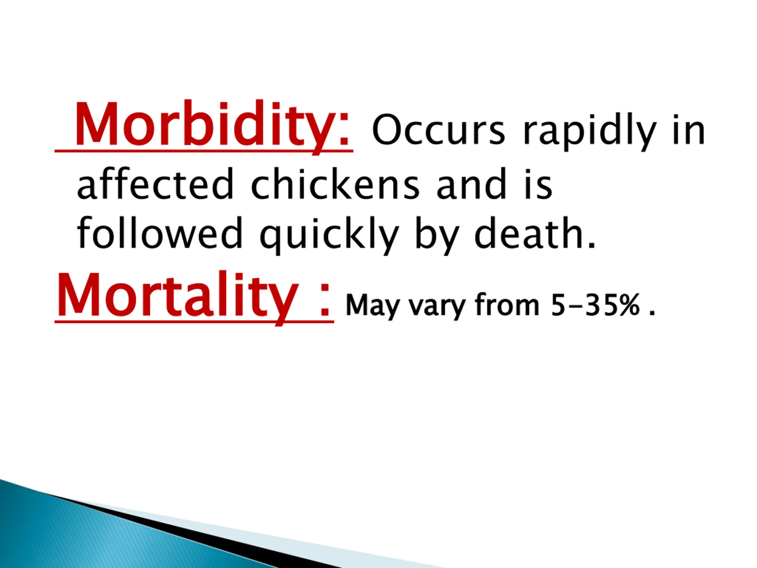 Morbidity: affected chickens and is followed quickly by death. Mortality : Morbidity: Occurs rapidly in Mortality : May vary from May vary from 5 5- -35 35% . % .