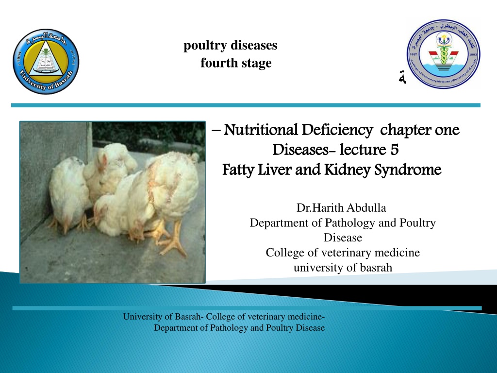 poultry diseases fourth stage Nutritional Deficiency Diseases Fatty Liver and Kidney Syndrome Nutritional Deficiency Diseases- - lecture Fatty Liver and Kidney Syndrome chapter one chapter one lecture 5 5 Dr.HarithAbdulla Department of Pathology and Poultry Disease College of veterinary medicine university of basrah University of Basrah- College of veterinary medicine- Department of Pathology and Poultry Disease