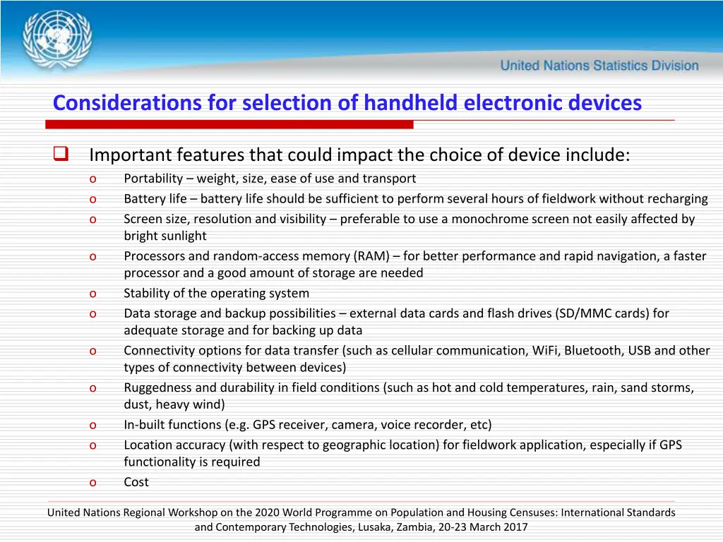 Considerations for selection of handheld electronic devices Important features that could impact the choice of device include: o Portability weight, size, ease of use and transport o Battery life battery life should be sufficient to perform several hours of fieldwork without recharging o Screen size, resolution and visibility preferable to use a monochrome screen not easily affected by bright sunlight o Processors and random-access memory (RAM) for better performance and rapid navigation, a faster processor and a good amount of storage are needed o Stability of the operating system o Data storage and backup possibilities external data cards and flash drives (SD/MMC cards) for adequate storage and for backing up data o Connectivity options for data transfer (such as cellular communication, WiFi, Bluetooth, USB and other types of connectivity between devices) o Ruggedness and durability in field conditions (such as hot and cold temperatures, rain, sand storms, dust, heavy wind) o In-built functions (e.g. GPS receiver, camera, voice recorder, etc) o Location accuracy (with respect to geographic location) for fieldwork application, especially if GPS functionality is required o Cost United Nations Regional Workshop on the 2020 World Programme on Population and Housing Censuses: International Standards and Contemporary Technologies, Lusaka, Zambia, 20-23 March 2017