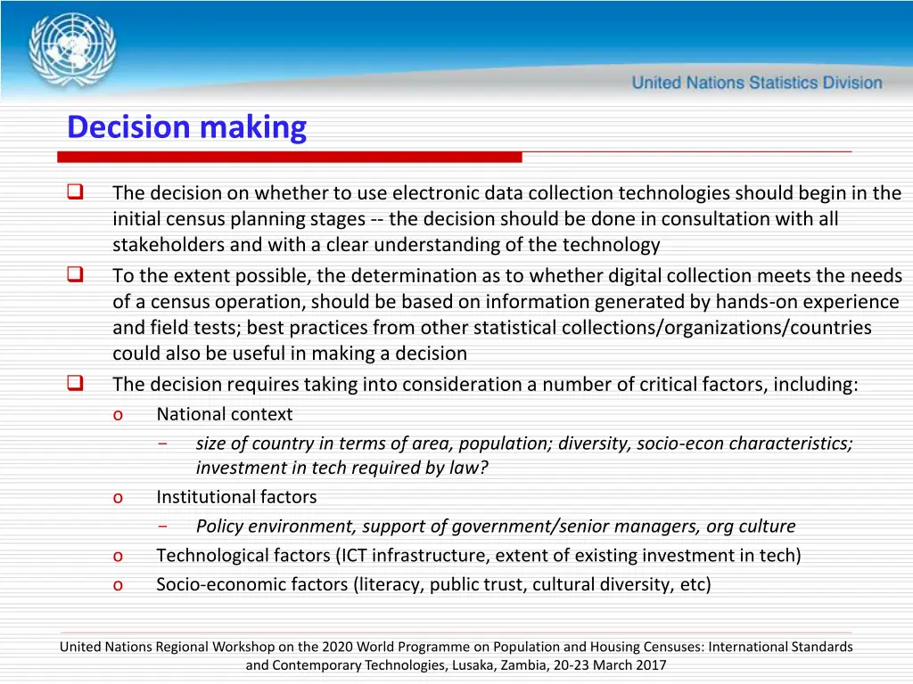 Decision making The decision on whether to use electronic data collection technologies should begin in the initial census planning stages -- the decision should be done in consultation with all stakeholders and with a clear understanding of the technology To the extent possible, the determination as to whether digital collection meets the needs of a census operation, should be based on information generated by hands-on experience and field tests; best practices from other statistical collections/organizations/countries could also be useful in making a decision The decision requires taking into consideration a number of critical factors, including: o National context - size of country in terms of area, population; diversity, socio-econ characteristics; investment in tech required by law? o Institutional factors - Policy environment, support of government/senior managers, org culture o Technological factors (ICT infrastructure, extent of existing investment in tech) o Socio-economic factors (literacy, public trust, cultural diversity, etc) United Nations Regional Workshop on the 2020 World Programme on Population and Housing Censuses: International Standards and Contemporary Technologies, Lusaka, Zambia, 20-23 March 2017