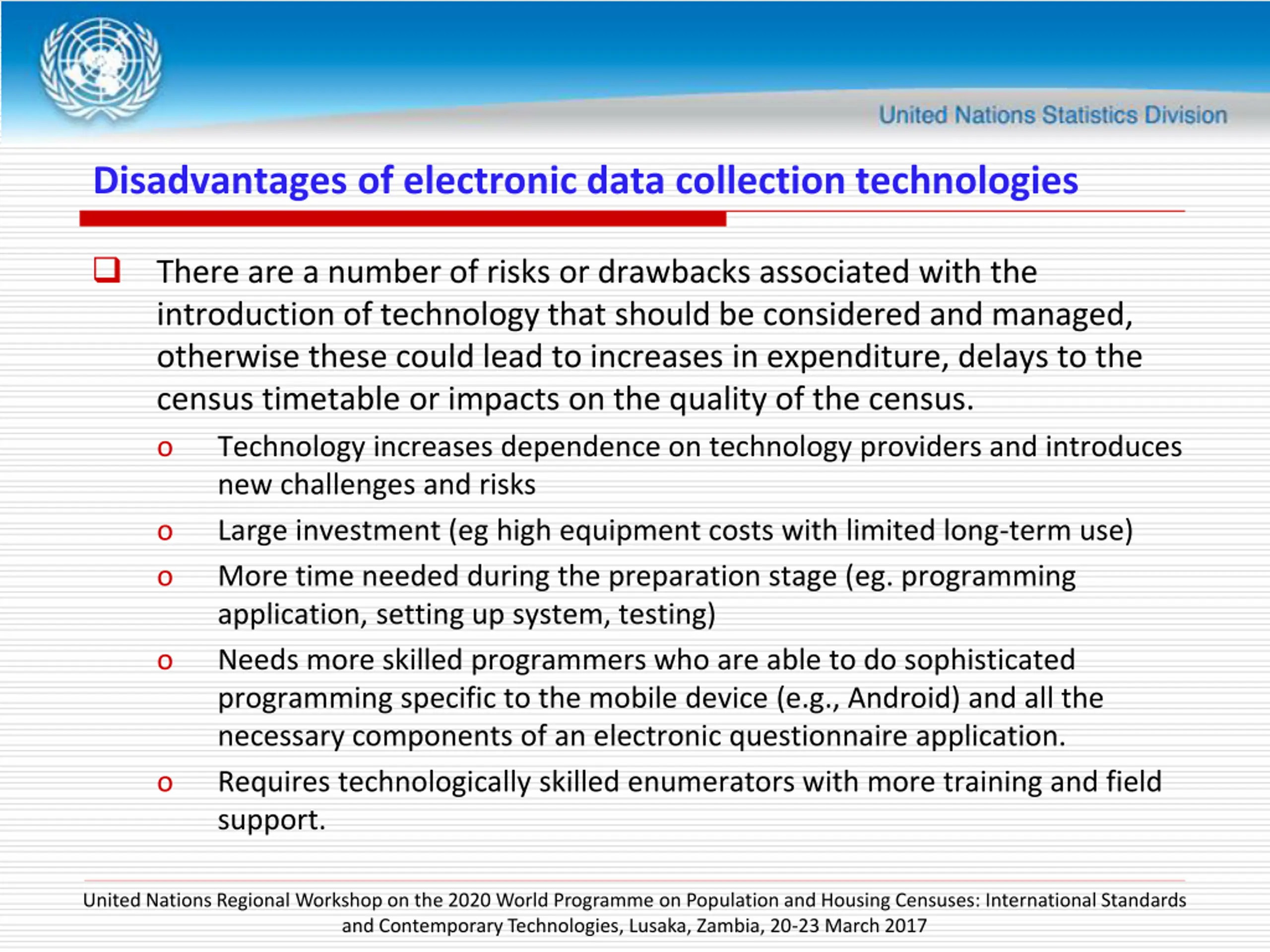 Disadvantages of electronic data collection technologies There are a number of risks or drawbacks associated with the introduction of technology that should be considered and managed, otherwise these could lead to increases in expenditure, delays to the census timetable or impacts on the quality of the census. o Technology increases dependence on technology providers and introduces new challenges and risks o Large investment (eg high equipment costs with limited long-term use) o More time needed during the preparation stage (eg. programming application, setting up system, testing) o Needs more skilled programmers who are able to do sophisticated programming specific to the mobile device (e.g., Android) and all the necessary components of an electronic questionnaire application. o Requires technologically skilled enumerators with more training and field support. United Nations Regional Workshop on the 2020 World Programme on Population and Housing Censuses: International Standards and Contemporary Technologies, Lusaka, Zambia, 20-23 March 2017