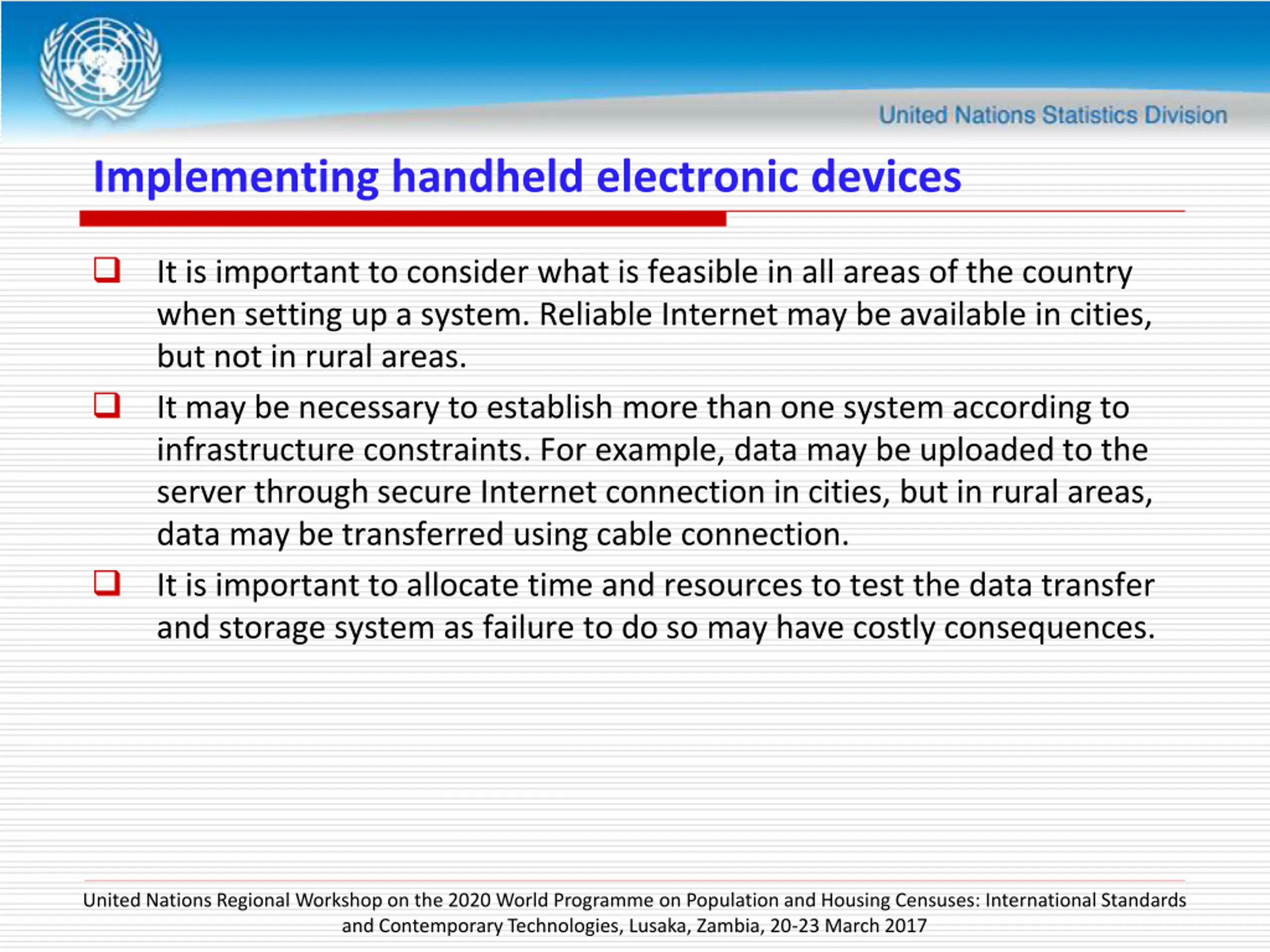 Implementing handheld electronic devices It is important to consider what is feasible in all areas of the country when setting up a system. Reliable Internet may be available in cities, but not in rural areas. It may be necessary to establish more than one system according to infrastructure constraints. For example, data may be uploaded to the server through secure Internet connection in cities, but in rural areas, data may be transferred using cable connection. It is important to allocate time and resources to test the data transfer and storage system as failure to do so may have costly consequences. United Nations Regional Workshop on the 2020 World Programme on Population and Housing Censuses: International Standards and Contemporary Technologies, Lusaka, Zambia, 20-23 March 2017
