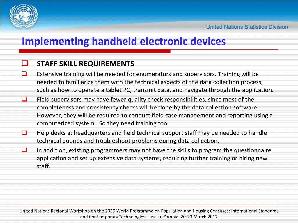 Implementing handheld electronic devices STAFF SKILL REQUIREMENTS Extensive training will be needed for enumerators and supervisors. Training will be needed to familiarize them with the technical aspects of the data collection process, such as how to operate a tablet PC, transmit data, and navigate through the application. Field supervisors may have fewer quality check responsibilities, since most of the completeness and consistency checks will be done by the data collection software. However, they will be required to conduct field case management and reporting using a computerized system. So they need training too. Help desks at headquarters and field technical support staff may be needed to handle technical queries and troubleshoot problems during data collection. In addition, existing programmers may not have the skills to program the questionnaire application and set up extensive data systems, requiring further training or hiring new staff. United Nations Regional Workshop on the 2020 World Programme on Population and Housing Censuses: International Standards and Contemporary Technologies, Lusaka, Zambia, 20-23 March 2017