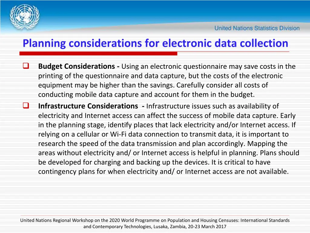 Planning considerations for electronic data collection Budget Considerations - Using an electronic questionnaire may save costs in the printing of the questionnaire and data capture, but the costs of the electronic equipment may be higher than the savings. Carefully consider all costs of conducting mobile data capture and account for them in the budget. Infrastructure Considerations - Infrastructure issues such as availability of electricity and Internet access can affect the success of mobile data capture. Early in the planning stage, identify places that lack electricity and/or Internet access. If relying on a cellular or Wi-Fi data connection to transmit data, it is important to research the speed of the data transmission and plan accordingly. Mapping the areas without electricity and/ or Internet access is helpful in planning. Plans should be developed for charging and backing up the devices. It is critical to have contingency plans for when electricity and/ or Internet access are not available. United Nations Regional Workshop on the 2020 World Programme on Population and Housing Censuses: International Standards and Contemporary Technologies, Lusaka, Zambia, 20-23 March 2017