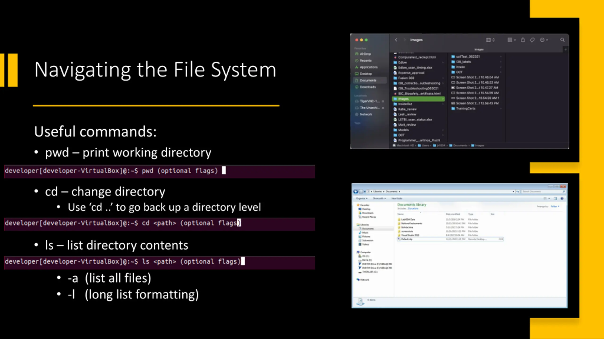 Navigating the File System Useful commands: pwd print working directory cd change directory Use cd .. to go back up a directory level ls list directory contents -a (list all files) -l (long list formatting)