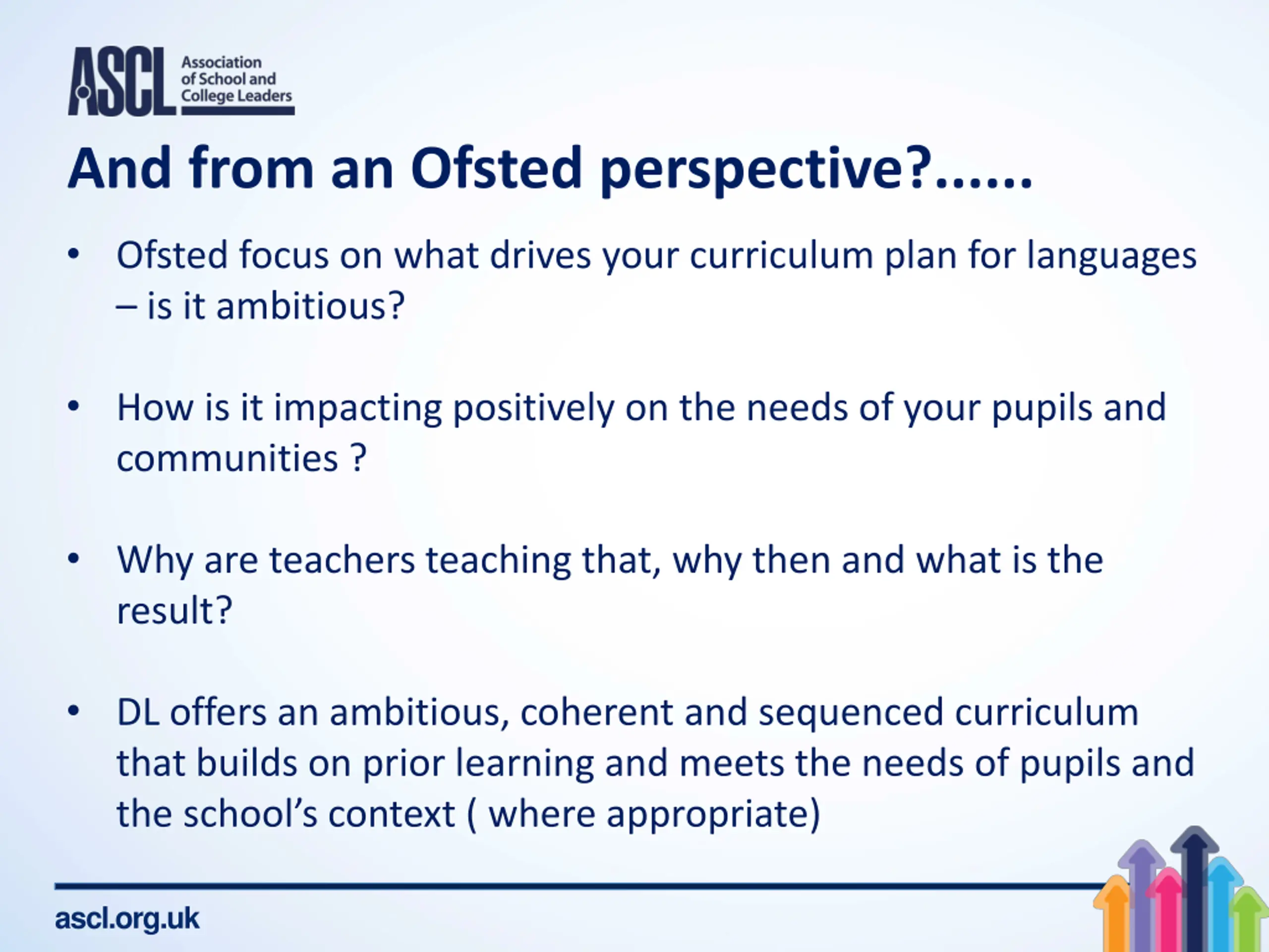 And from an Ofsted perspective?...... Ofsted focus on what drives your curriculum plan for languages is it ambitious? How is it impacting positively on the needs of your pupils and communities ? Why are teachers teaching that, why then and what is the result? DL offers an ambitious, coherent and sequenced curriculum that builds on prior learning and meets the needs of pupils and the school s context ( where appropriate) ascl.org.uk