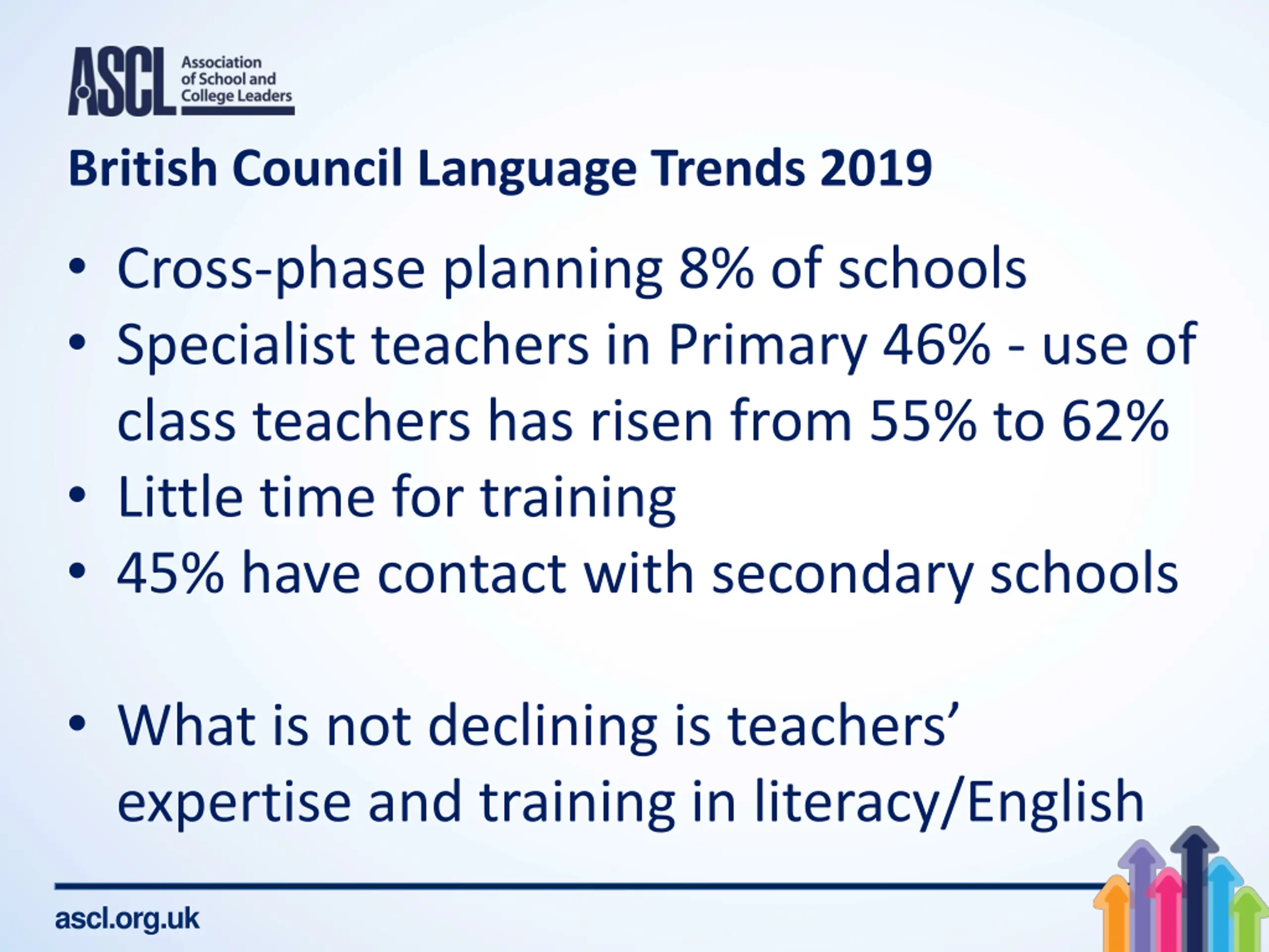 British Council Language Trends 2019 Cross-phase planning 8% of schools Specialist teachers in Primary 46% - use of class teachers has risen from 55% to 62% Little time for training 45% have contact with secondary schools What is not declining is teachers expertise and training in literacy/English ascl.org.uk