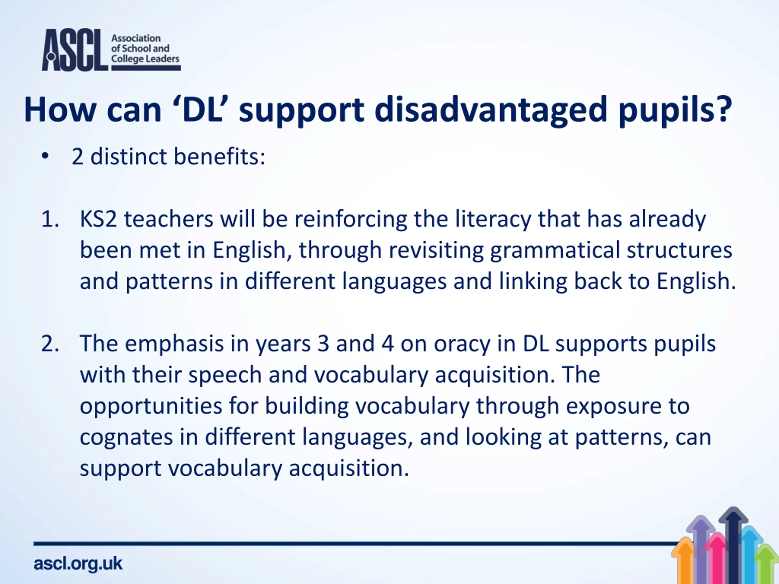 How can DL support disadvantaged pupils? 2 distinct benefits: 1. KS2 teachers will be reinforcing the literacy that has already been met in English, through revisiting grammatical structures and patterns in different languages and linking back to English. 2. The emphasis in years 3 and 4 on oracy in DL supports pupils with their speech and vocabulary acquisition. The opportunities for building vocabulary through exposure to cognates in different languages, and looking at patterns, can support vocabulary acquisition. ascl.org.uk