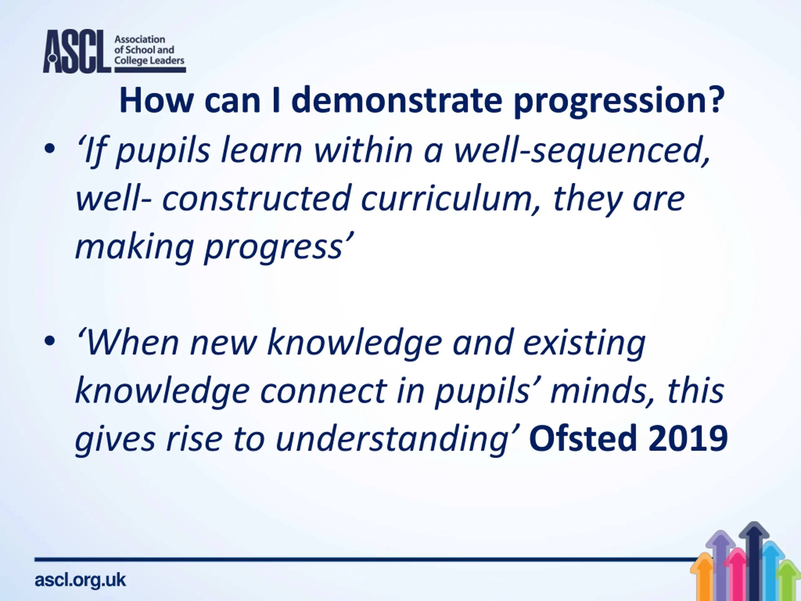 How can I demonstrate progression? If pupils learn within a well-sequenced, well- constructed curriculum, they are making progress When new knowledge and existing knowledge connect in pupils minds, this gives rise to understanding Ofsted 2019 ascl.org.uk