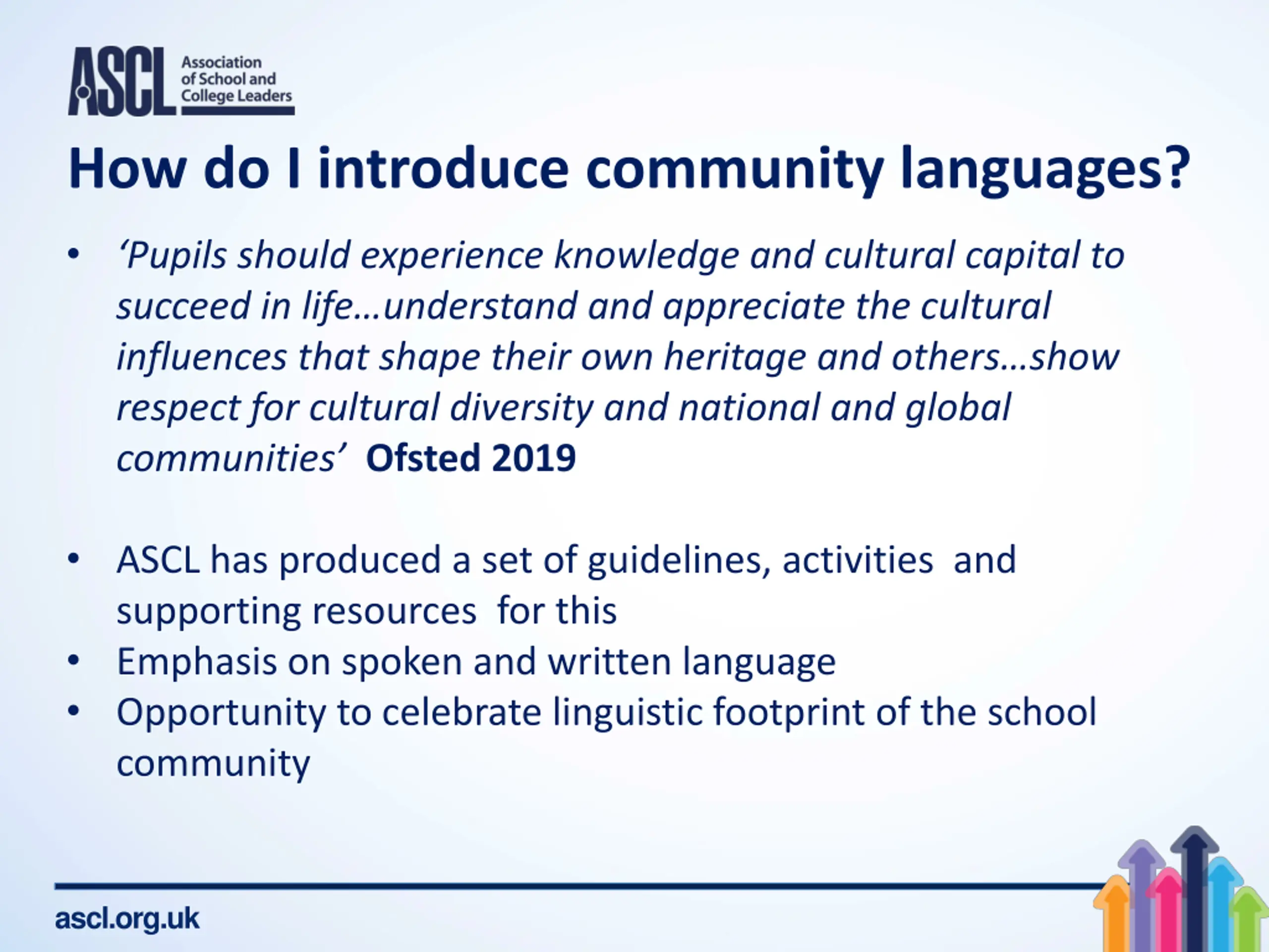 How do I introduce community languages? Pupils should experience knowledge and cultural capital to succeed in life understand and appreciate the cultural influences that shape their own heritage and others show respect for cultural diversity and national and global communities Ofsted 2019 ASCL has produced a set of guidelines, activities and supporting resources for this Emphasis on spoken and written language Opportunity to celebrate linguistic footprint of the school community ascl.org.uk