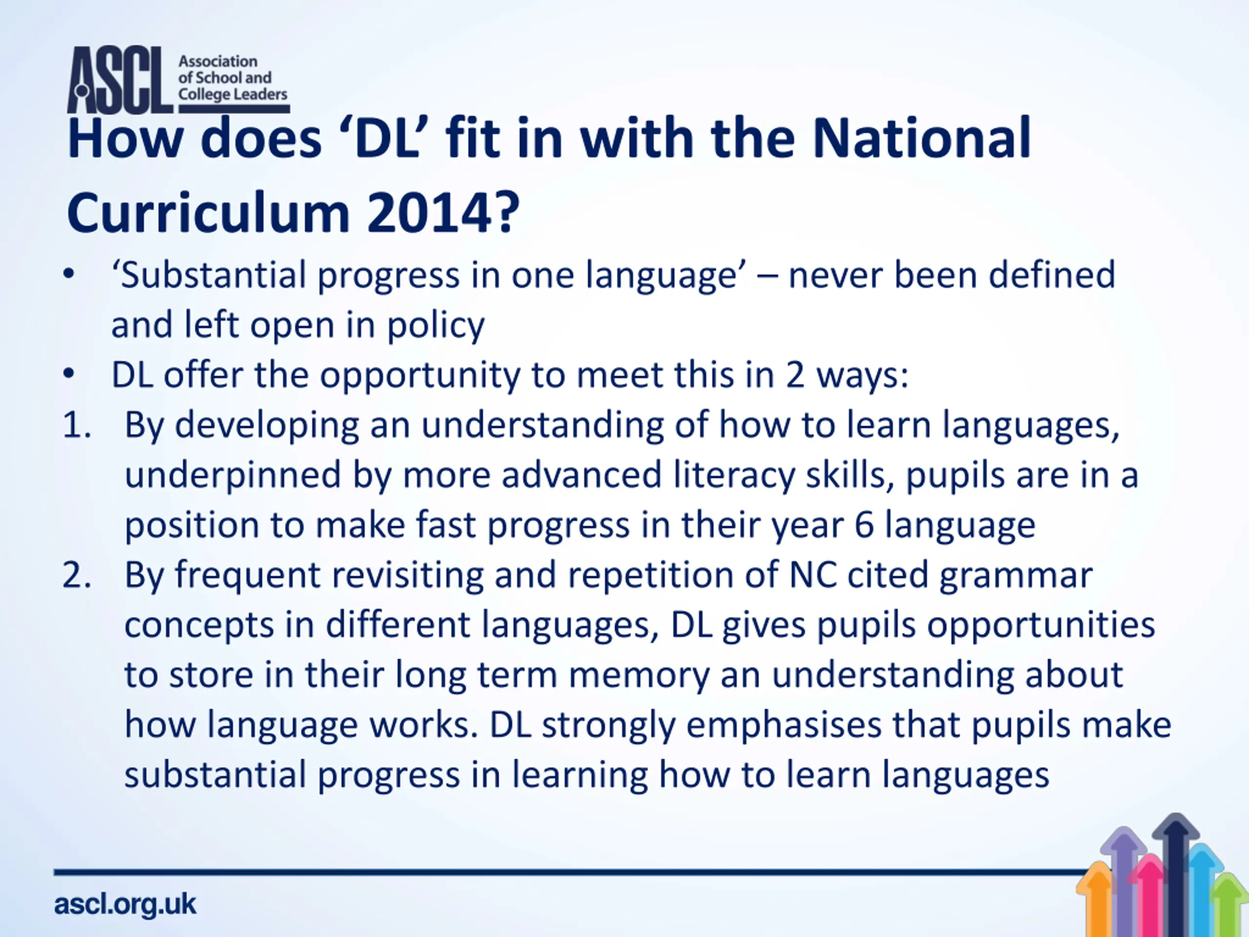 How does DL fit in with the National Curriculum 2014? Substantial progress in one language never been defined and left open in policy DL offer the opportunity to meet this in 2 ways: 1. By developing an understanding of how to learn languages, underpinned by more advanced literacy skills, pupils are in a position to make fast progress in their year 6 language 2. By frequent revisiting and repetition of NC cited grammar concepts in different languages, DL gives pupils opportunities to store in their long term memory an understanding about how language works. DL strongly emphasises that pupils make substantial progress in learning how to learn languages ascl.org.uk