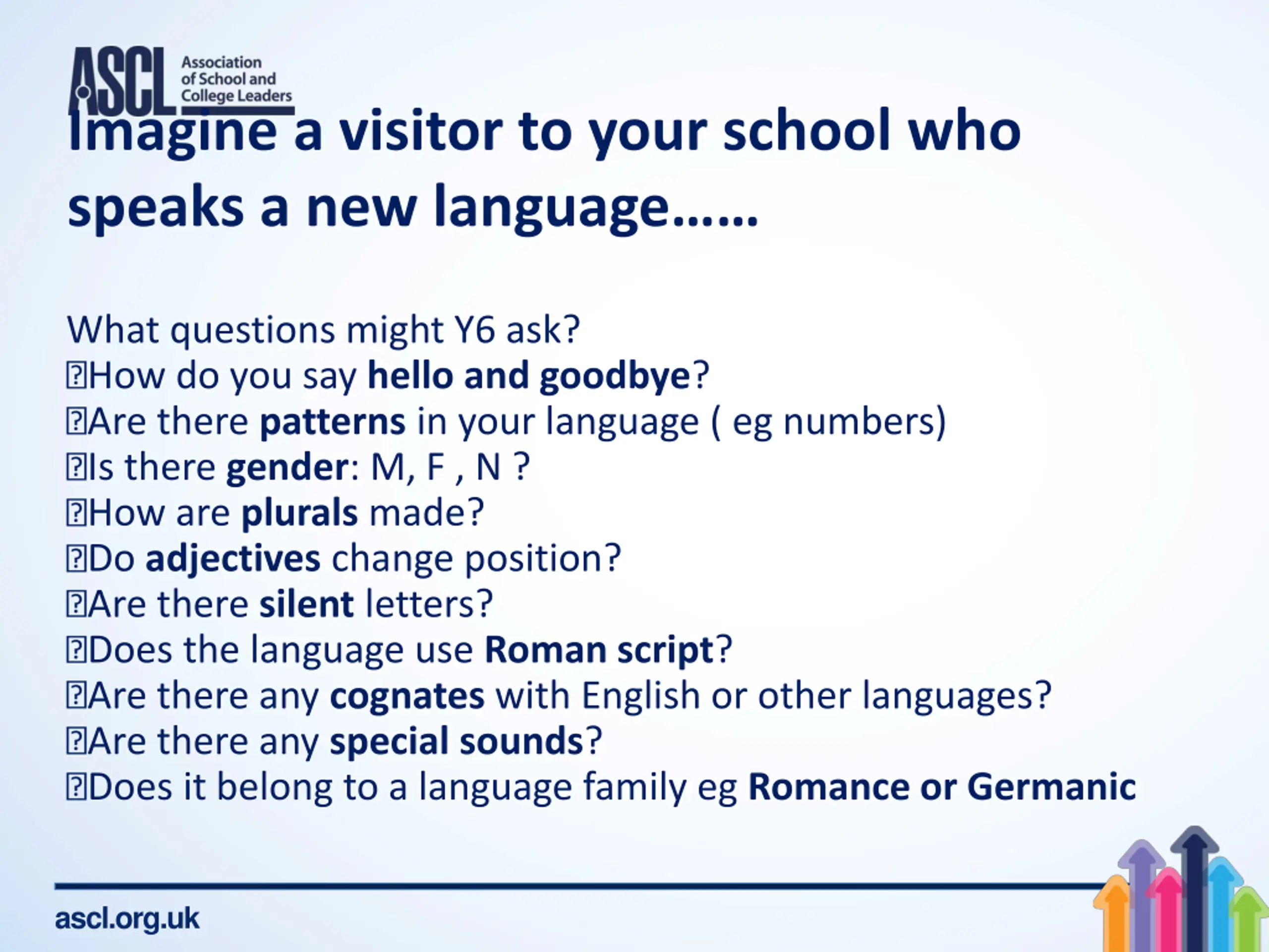 Imagine a visitor to your school who speaks a new language What questions might Y6 ask? How do you say hello and goodbye? Are there patterns in your language ( eg numbers) Is there gender: M, F , N ? How are plurals made? Do adjectives change position? Are there silent letters? Does the language use Roman script? Are there any cognates with English or other languages? Are there any special sounds? Does it belong to a language family eg Romance or Germanic ascl.org.uk