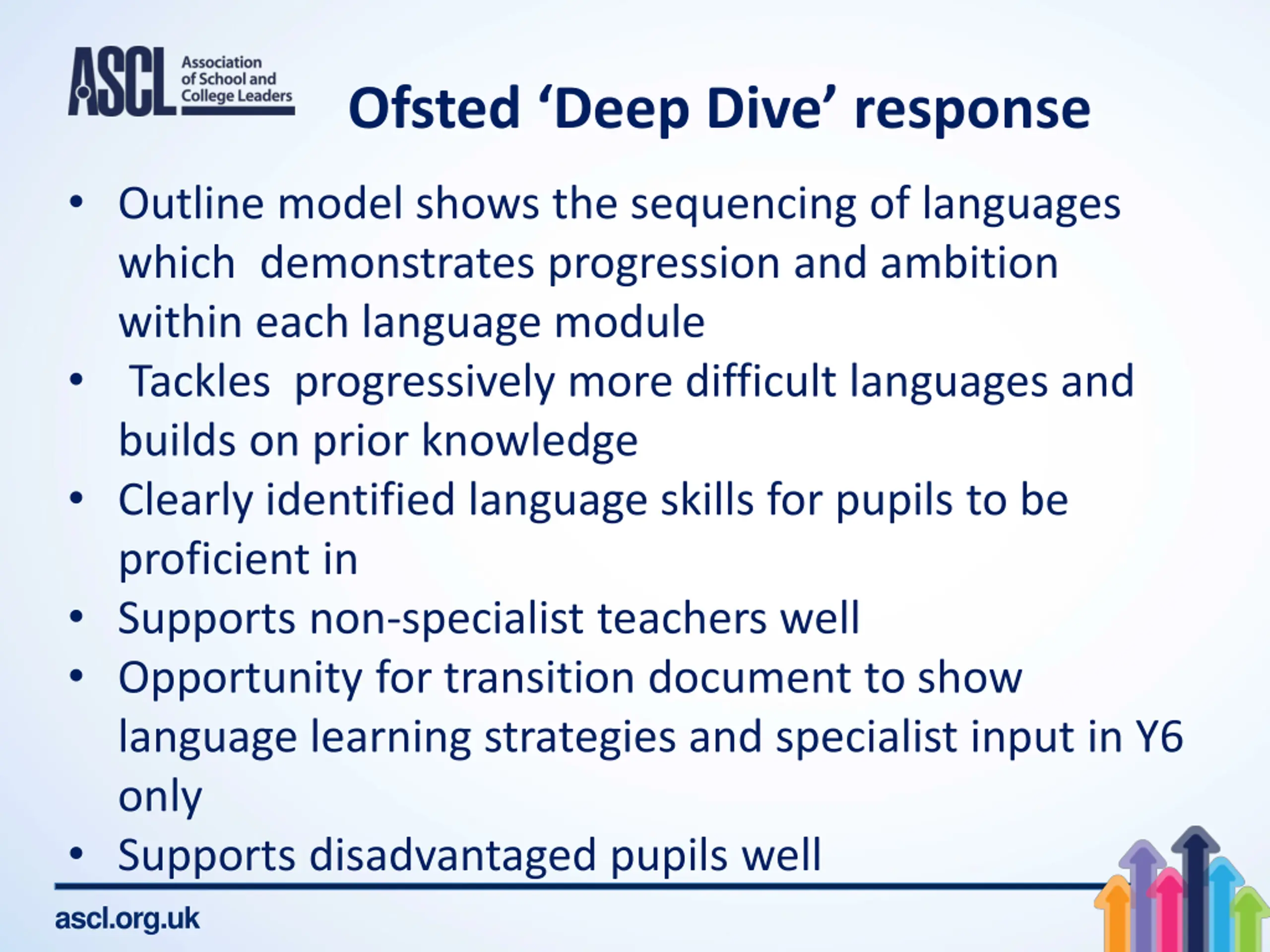 Ofsted Deep Dive response Outline model shows the sequencing of languages which demonstrates progression and ambition within each language module Tackles progressively more difficult languages and builds on prior knowledge Clearly identified language skills for pupils to be proficient in Supports non-specialist teachers well Opportunity for transition document to show language learning strategies and specialist input in Y6 only Supports disadvantaged pupils well ascl.org.uk