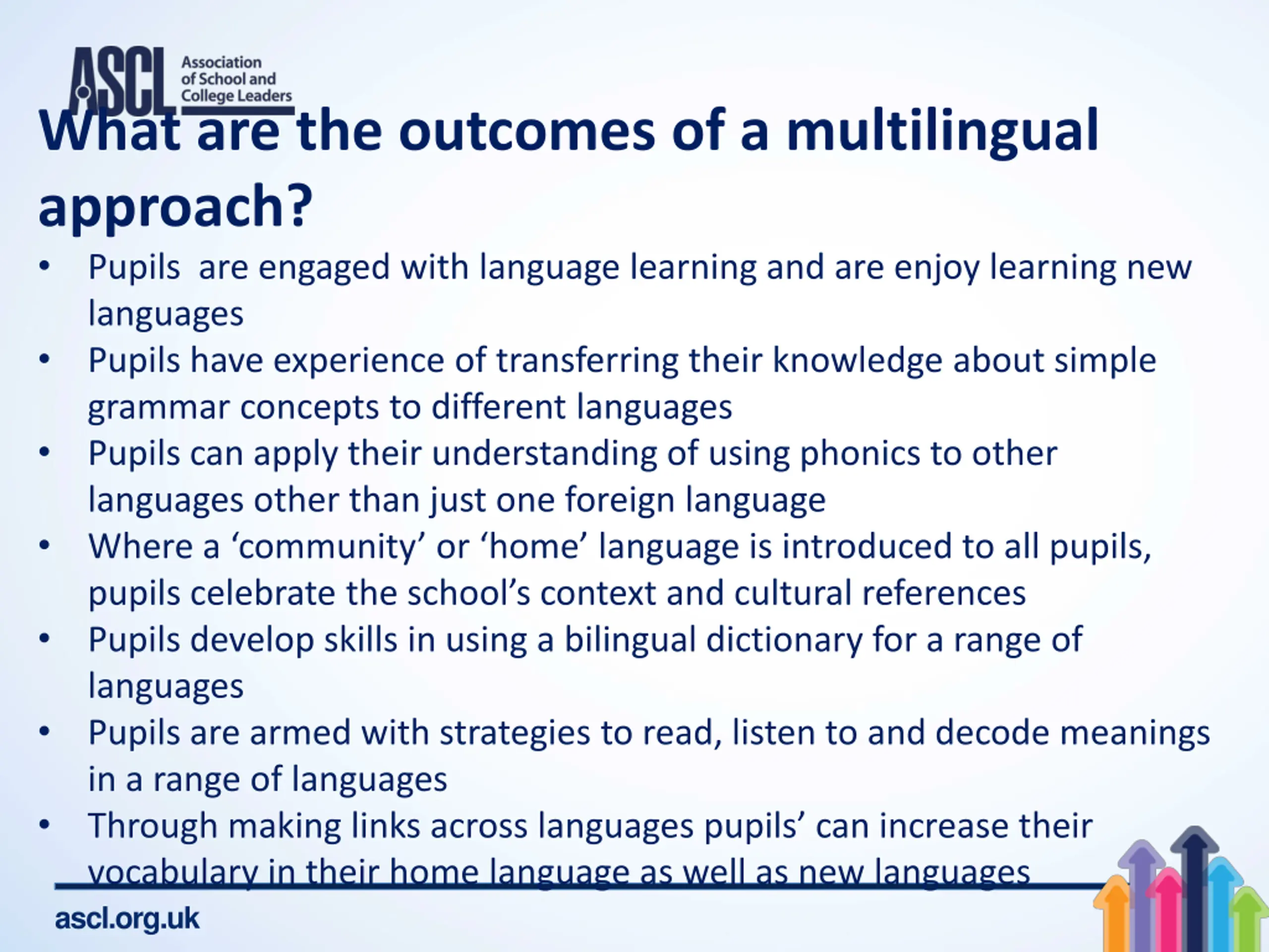 What are the outcomes of a multilingual approach? Pupils are engaged with language learning and are enjoy learning new languages Pupils have experience of transferring their knowledge about simple grammar concepts to different languages Pupils can apply their understanding of using phonics to other languages other than just one foreign language Where a community or home language is introduced to all pupils, pupils celebrate the school s context and cultural references Pupils develop skills in using a bilingual dictionary for a range of languages Pupils are armed with strategies to read, listen to and decode meanings in a range of languages Through making links across languages pupils can increase their vocabulary in their home language as well as new languages ascl.org.uk