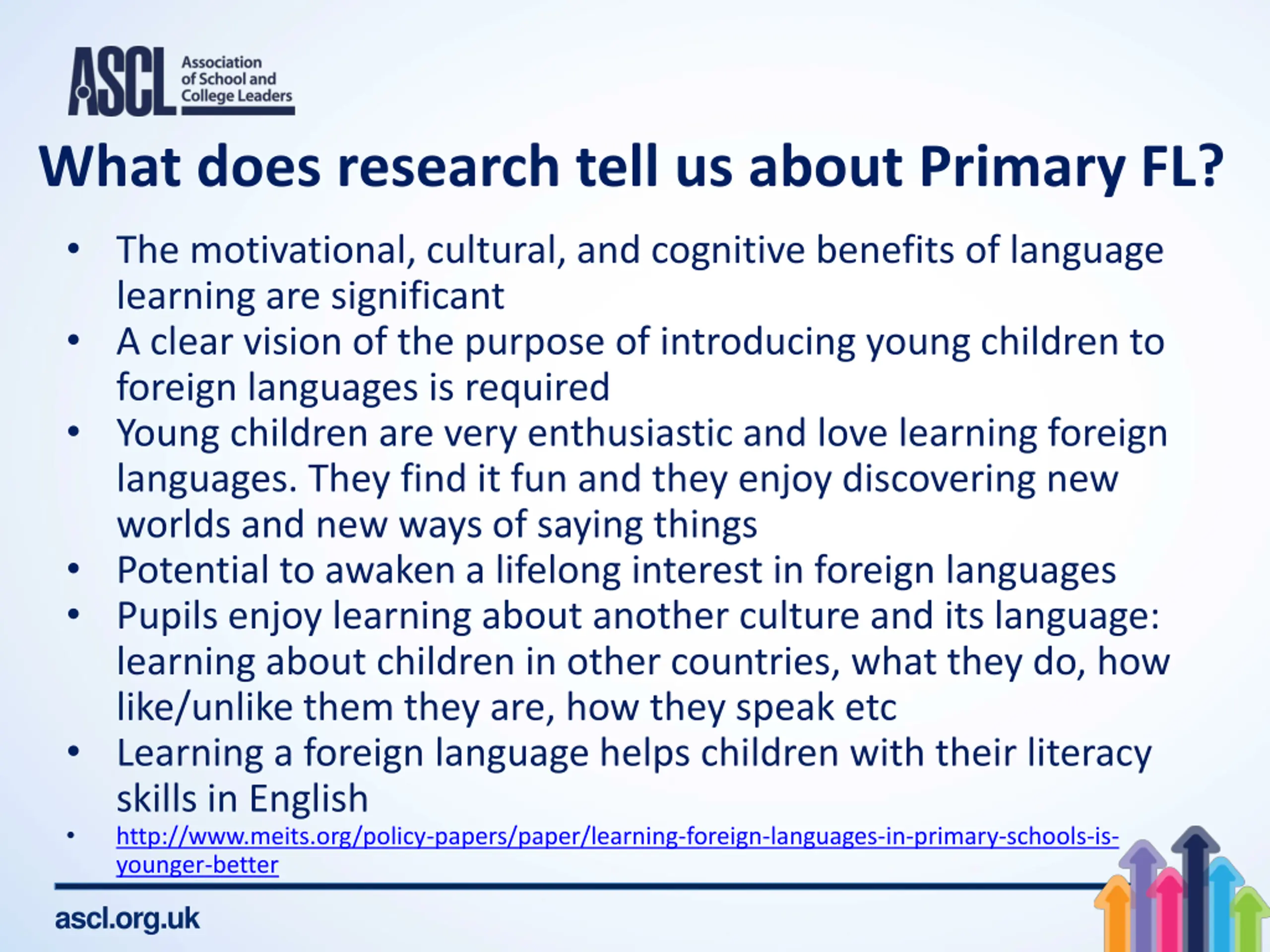 What does research tell us about Primary FL? The motivational, cultural, and cognitive benefits of language learning are significant A clear vision of the purpose of introducing young children to foreign languages is required Young children are very enthusiastic and love learning foreign languages. They find it fun and they enjoy discovering new worlds and new ways of saying things Potential to awaken a lifelong interest in foreign languages Pupils enjoy learning about another culture and its language: learning about children in other countries, what they do, how like/unlike them they are, how they speak etc Learning a foreign language helps children with their literacy skills in English http://www.meits.org/policy-papers/paper/learning-foreign-languages-in-primary-schools-is- younger-better ascl.org.uk