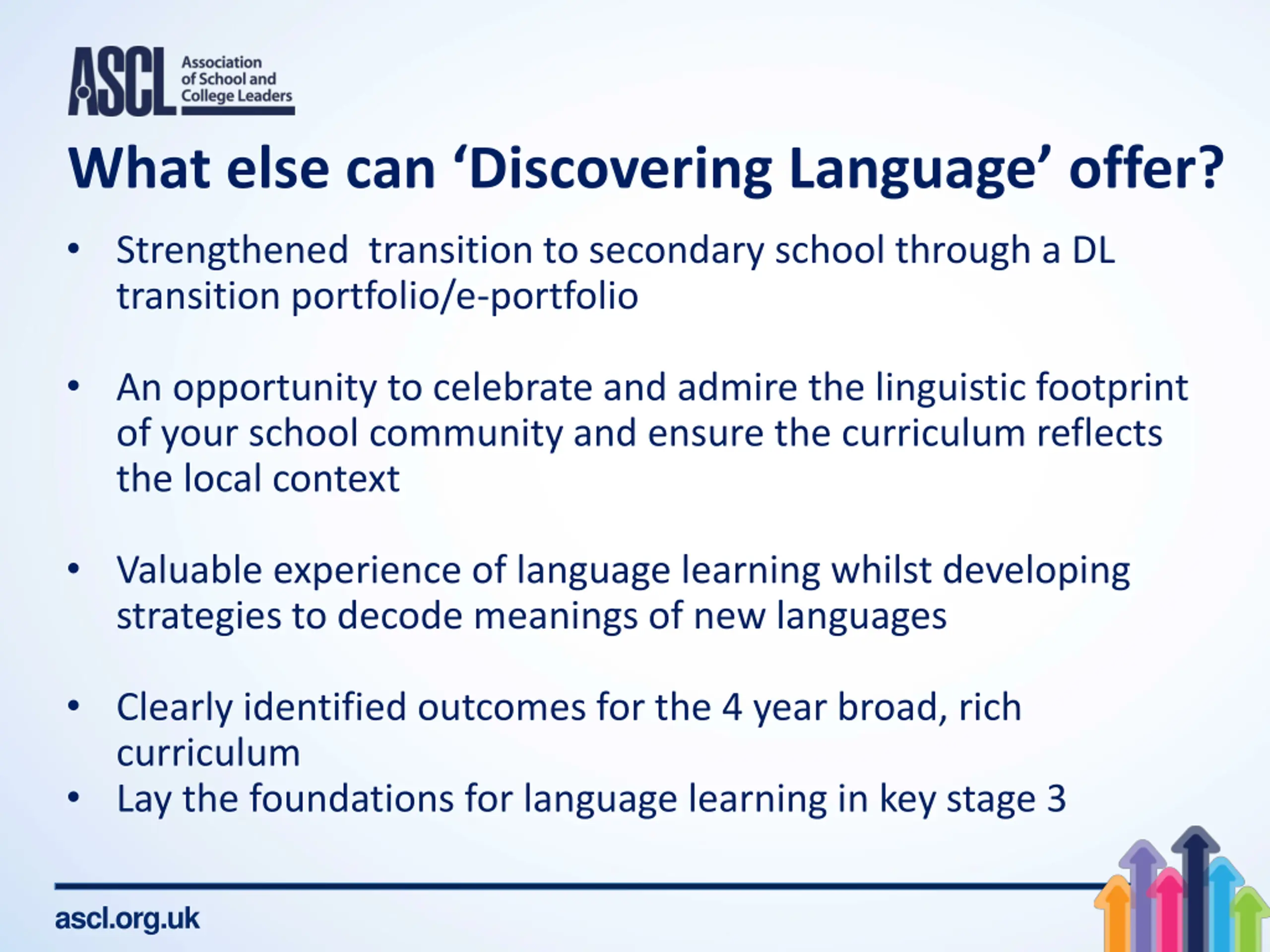 What else can Discovering Language offer? Strengthened transition to secondary school through a DL transition portfolio/e-portfolio An opportunity to celebrate and admire the linguistic footprint of your school community and ensure the curriculum reflects the local context Valuable experience of language learning whilst developing strategies to decode meanings of new languages Clearly identified outcomes for the 4 year broad, rich curriculum Lay the foundations for language learning in key stage 3 ascl.org.uk