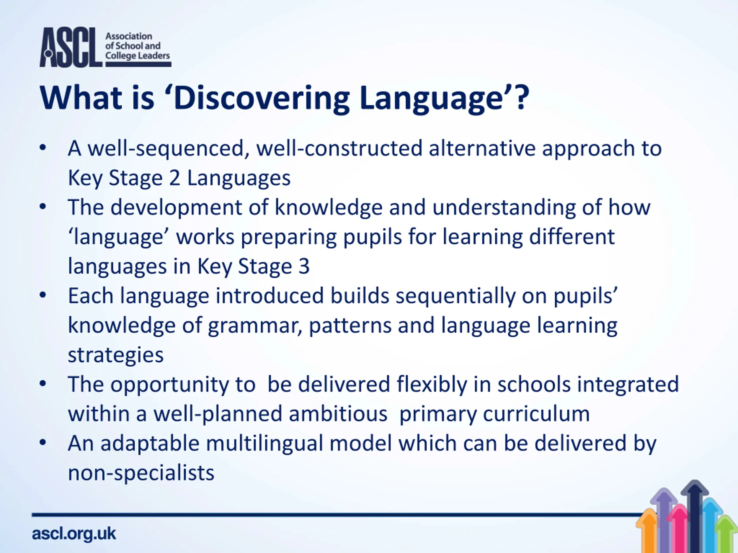 What is Discovering Language? A well-sequenced, well-constructed alternative approach to Key Stage 2 Languages The development of knowledge and understanding of how language works preparing pupils for learning different languages in Key Stage 3 Each language introduced builds sequentially on pupils knowledge of grammar, patterns and language learning strategies The opportunity to be delivered flexibly in schools integrated within a well-planned ambitious primary curriculum An adaptable multilingual model which can be delivered by non-specialists ascl.org.uk
