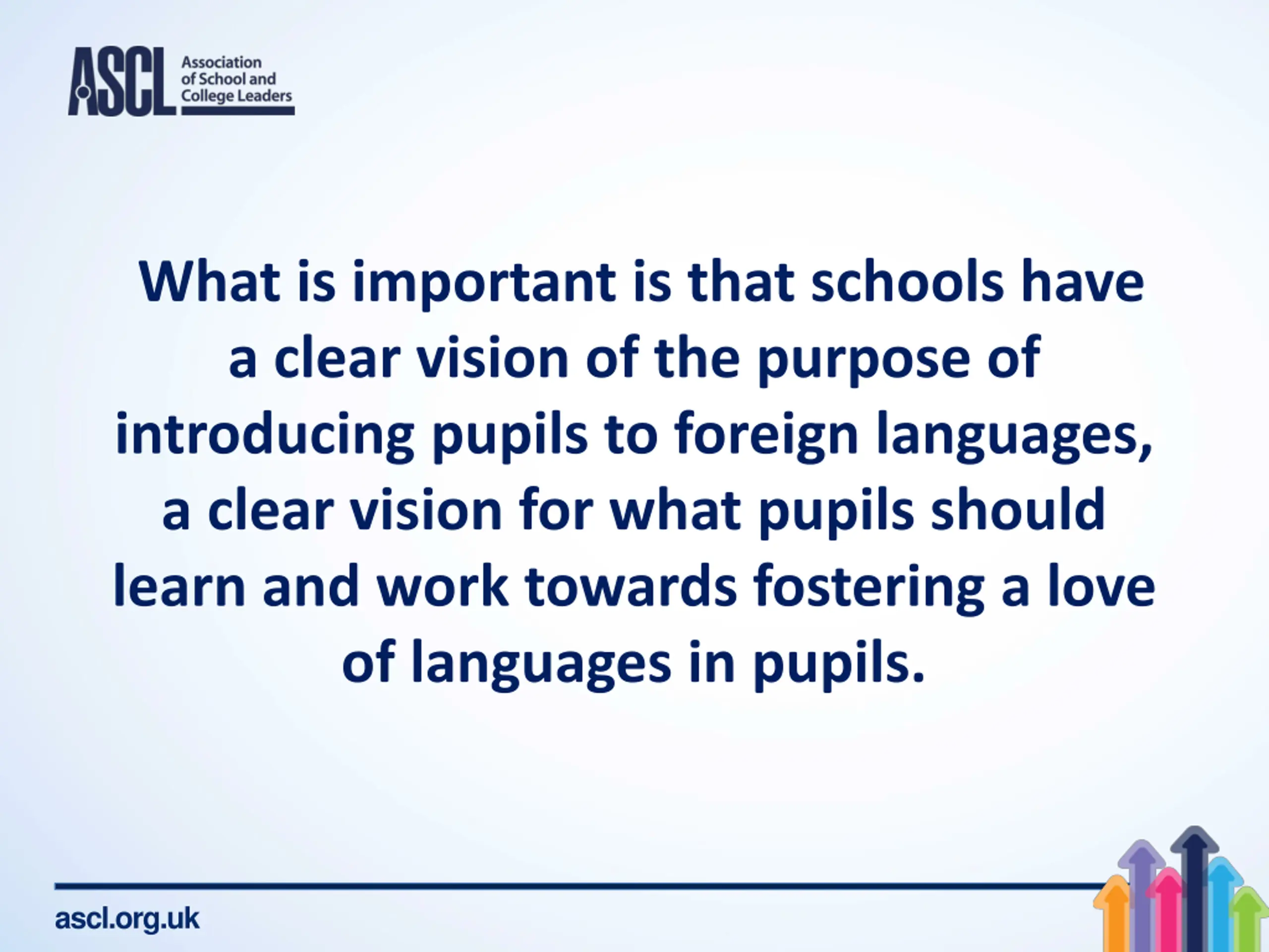 What is important is that schools have a clear vision of the purpose of introducing pupils to foreign languages, a clear vision for what pupils should learn and work towards fostering a love of languages in pupils. ascl.org.uk
