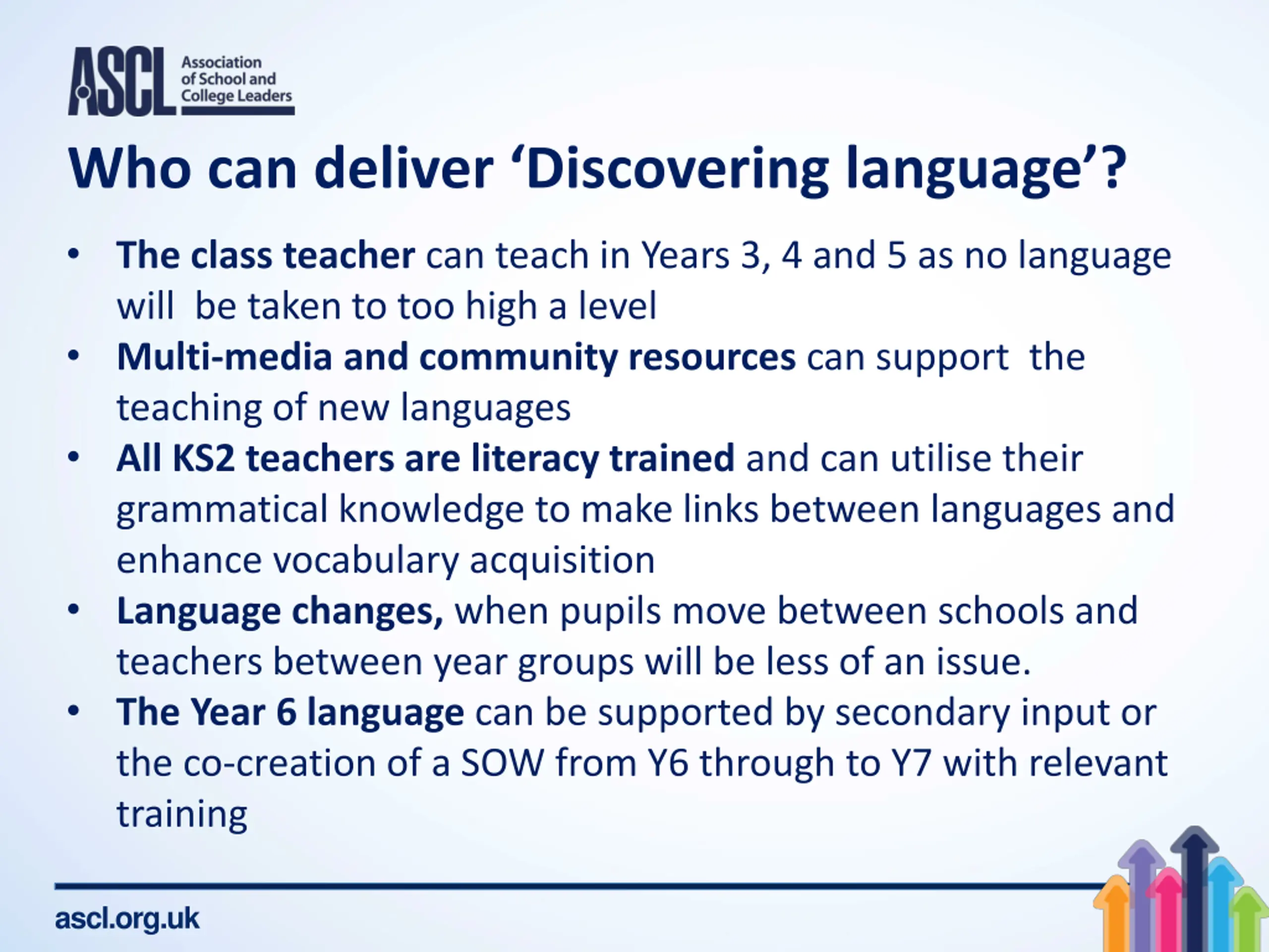 Who can deliver Discovering language? The class teacher can teach in Years 3, 4 and 5 as no language will be taken to too high a level Multi-media and community resources can support the teaching of new languages All KS2 teachers are literacy trained andcan utilise their grammatical knowledge to make links between languages and enhance vocabulary acquisition Language changes, when pupils move between schools and teachers between year groups will be less of an issue. The Year 6 language can be supported by secondary input or the co-creation of a SOW from Y6 through to Y7 with relevant training ascl.org.uk