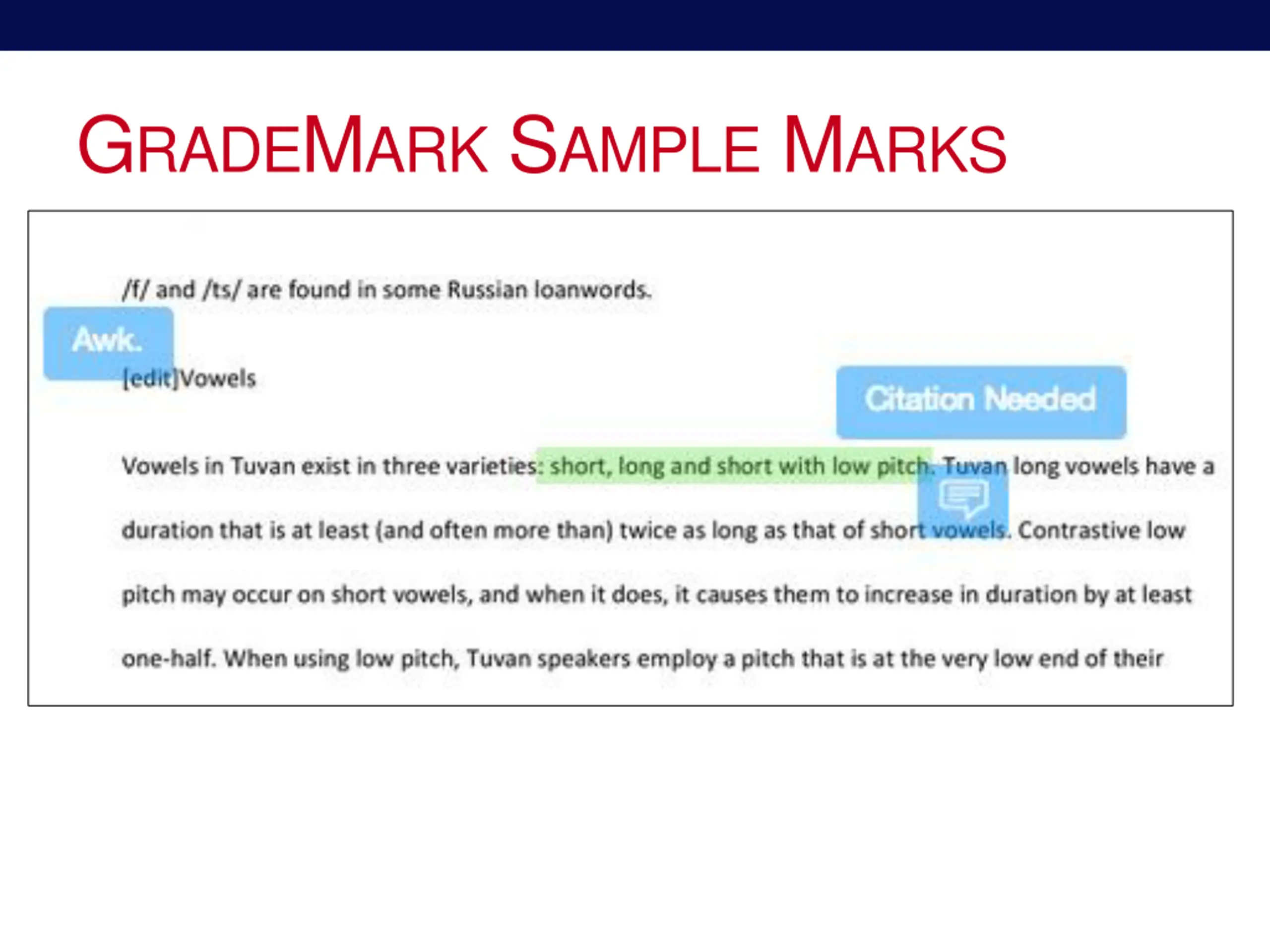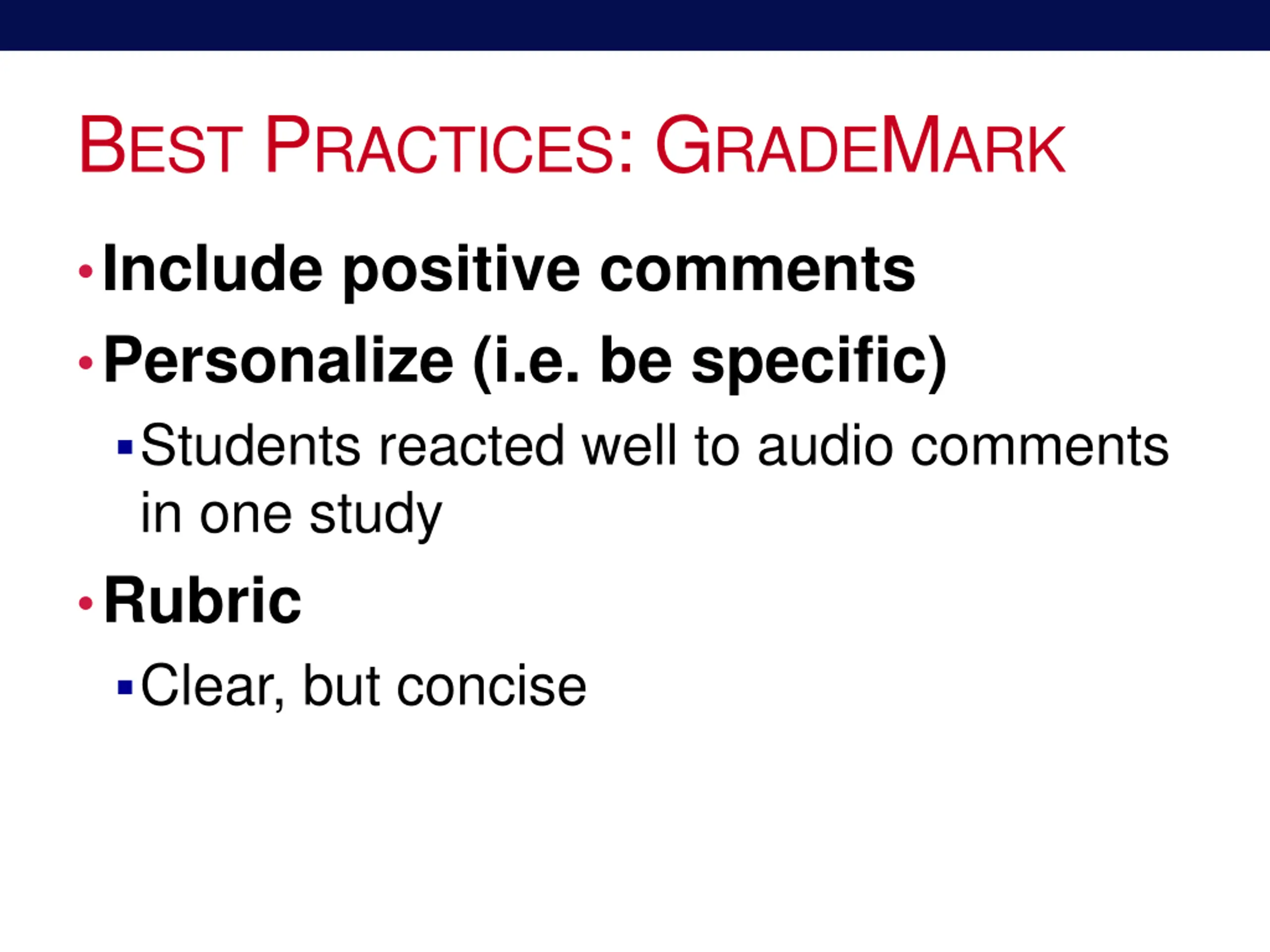 BEST PRACTICES: GRADEMARK Include positive comments Personalize (i.e. be specific) Students reacted well to audio comments in one study Rubric Clear, but concise