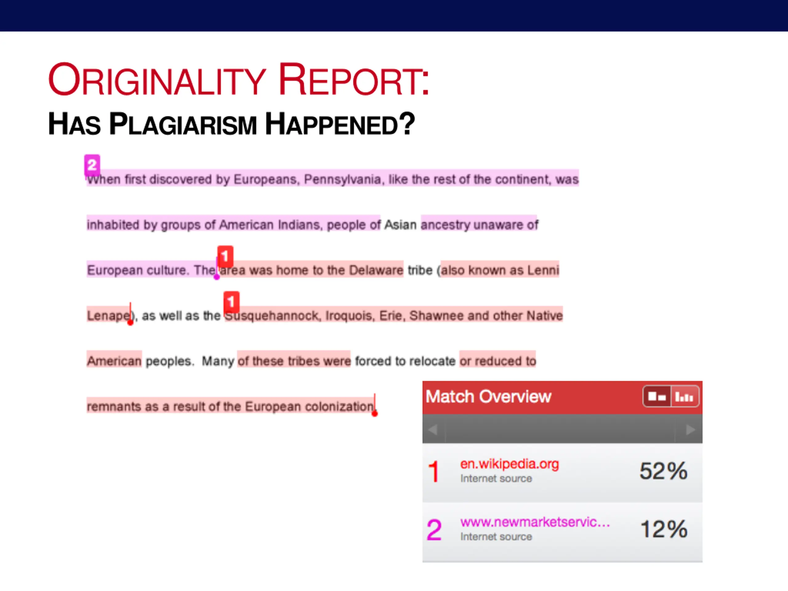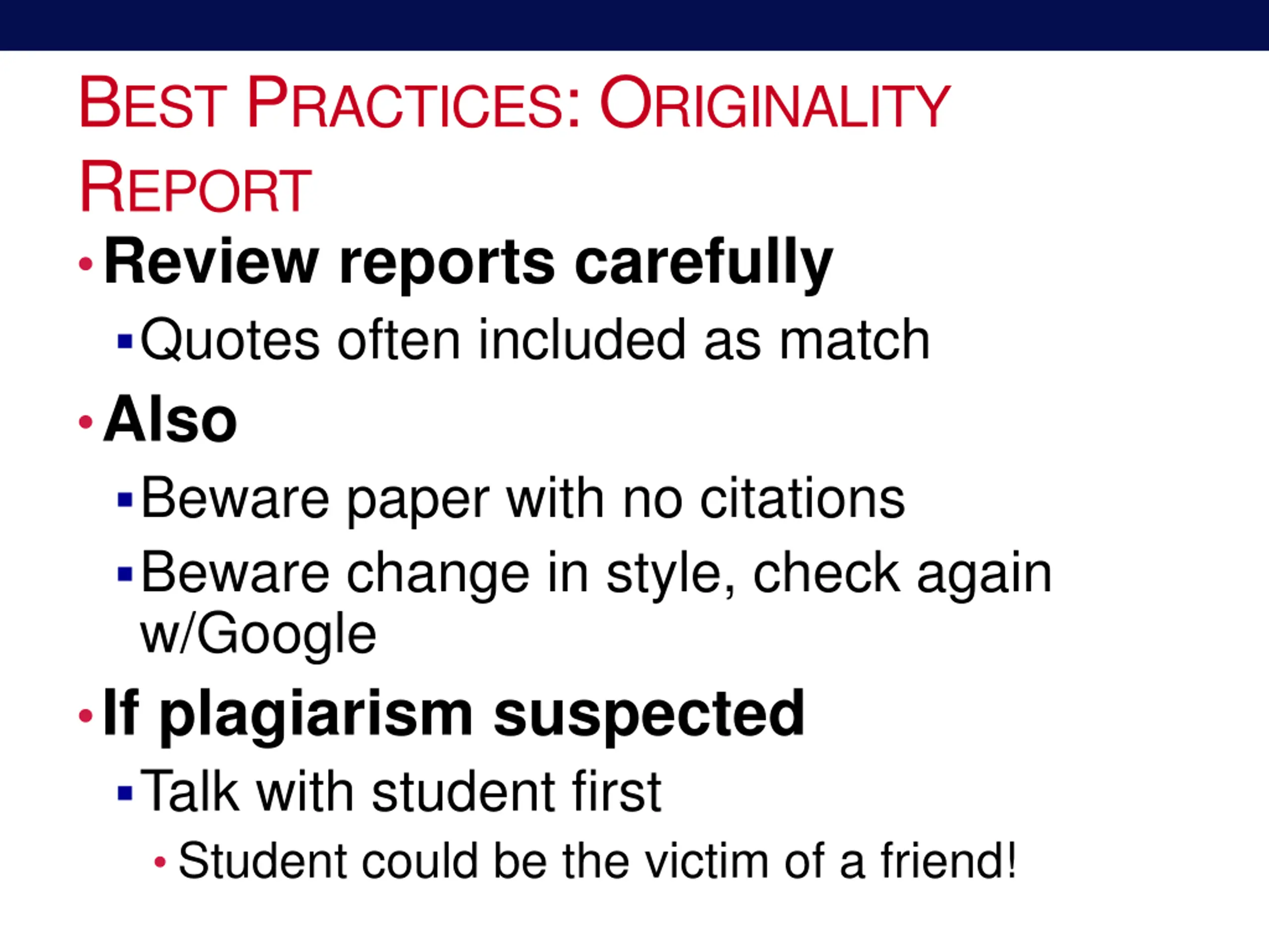 BEST PRACTICES: ORIGINALITY REPORT Review reports carefully Quotes often included as match Also Beware paper with no citations Beware change in style, check again w/Google If plagiarism suspected Talk with student first Student could be the victim of a friend!