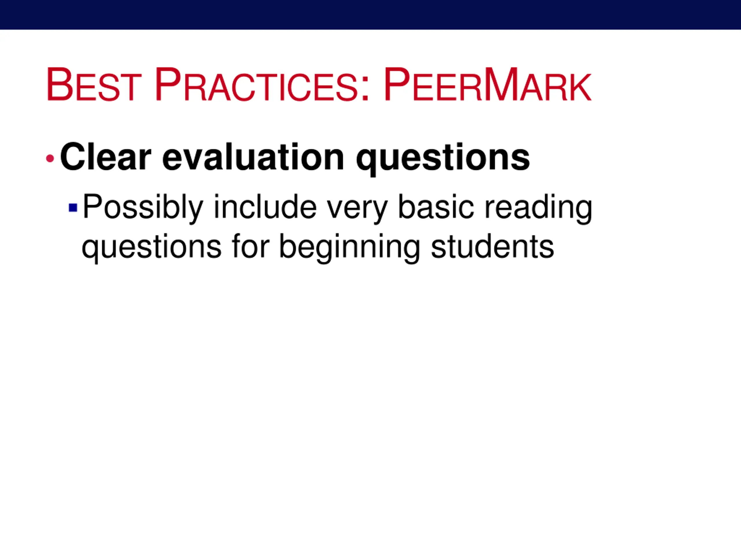 BEST PRACTICES: PEERMARK Clear evaluation questions Possibly include very basic reading questions for beginning students