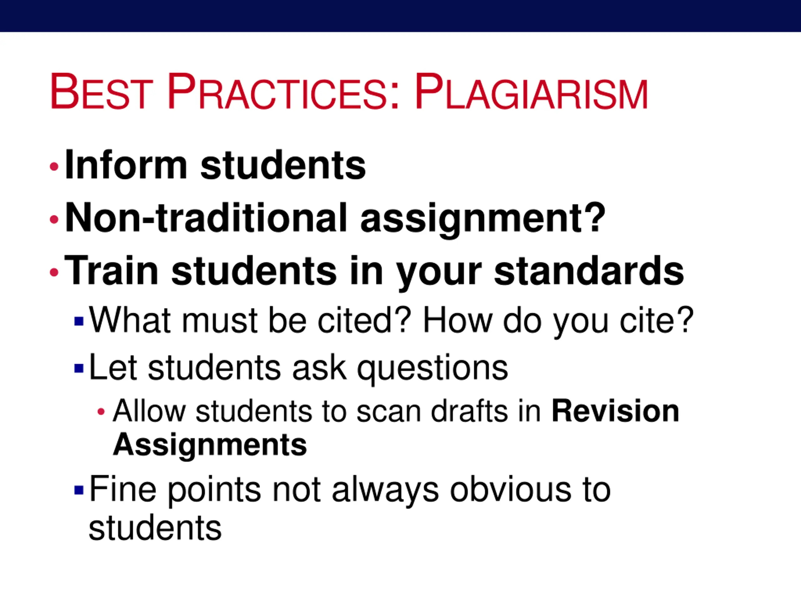 BEST PRACTICES: PLAGIARISM Inform students Non-traditional assignment? Train students in your standards What must be cited? How do you cite? Let students ask questions Allow students to scan drafts in Revision Assignments Fine points not always obvious to students
