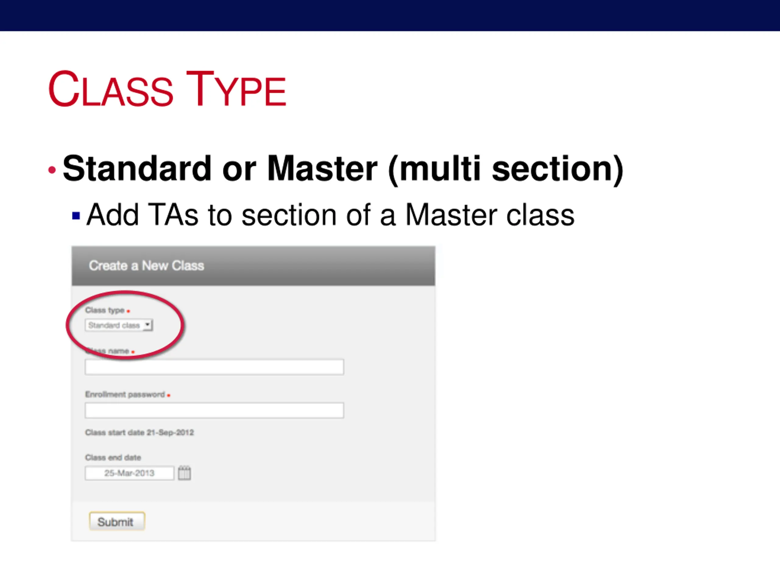 CLASS TYPE Standard or Master (multi section) Add TAs to section of a Master class