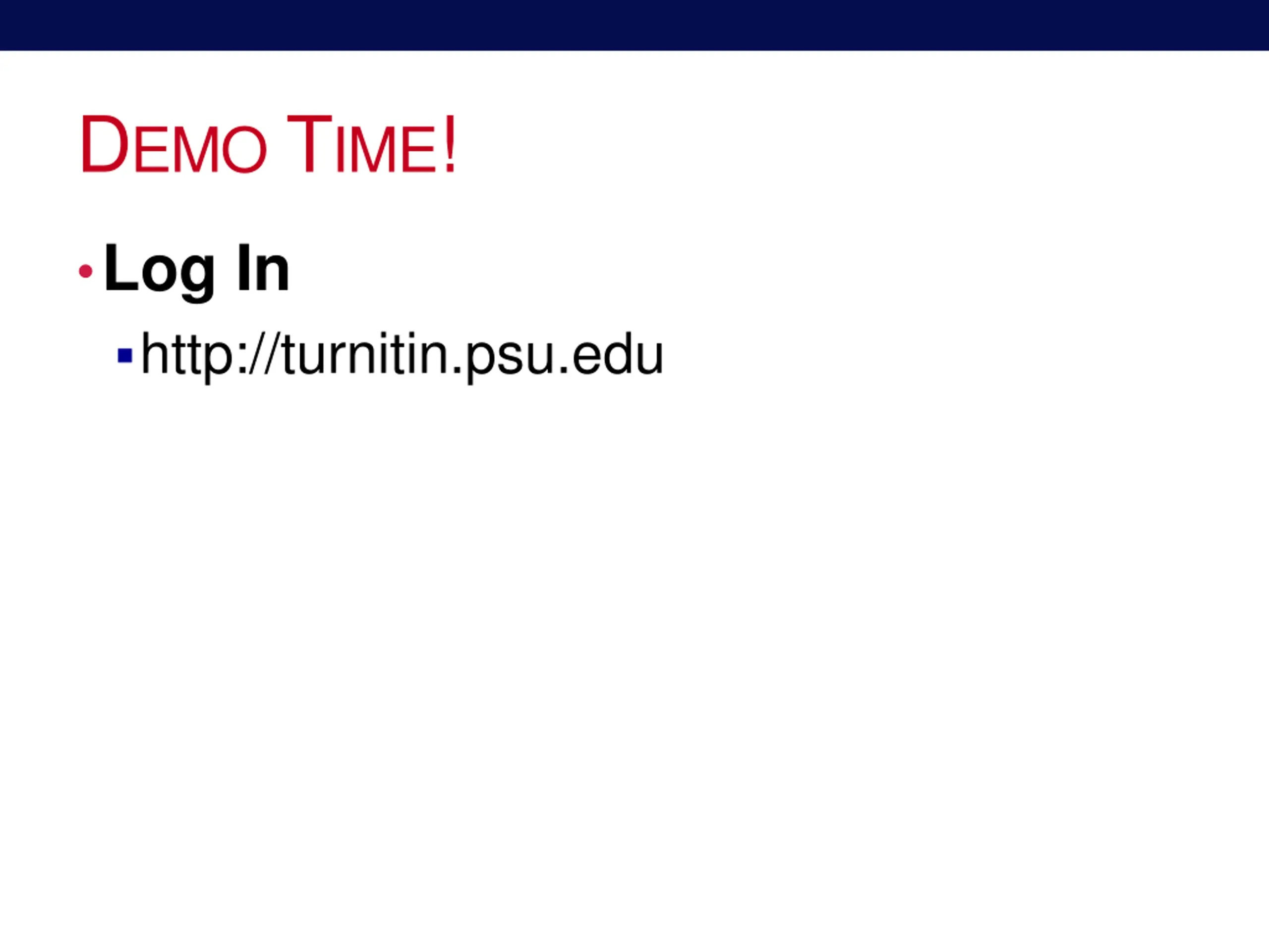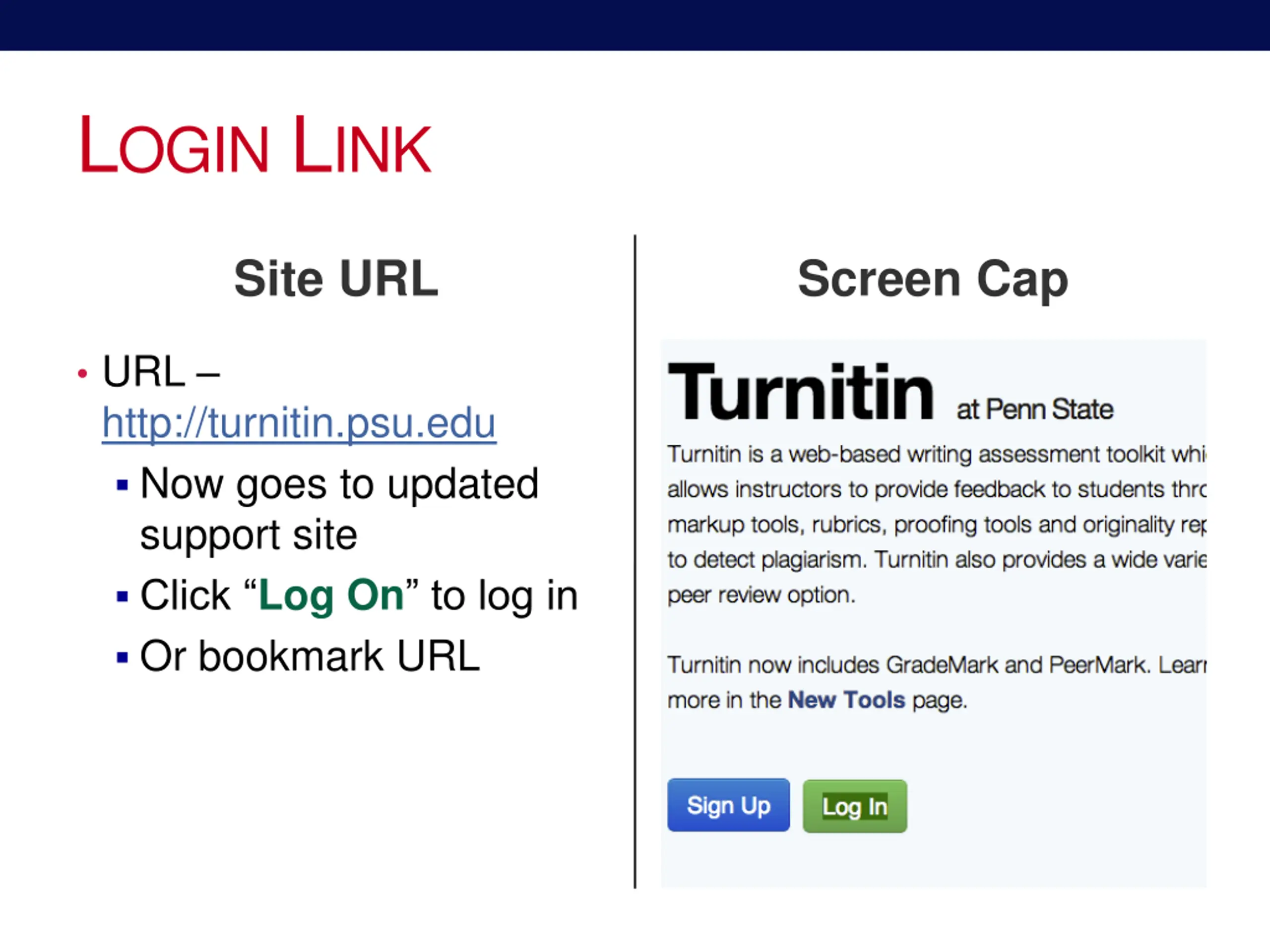 LOGIN LINK Site URL Screen Cap URL http://turnitin.psu.edu Now goes to updated support site Click Log On to log in Or bookmark URL