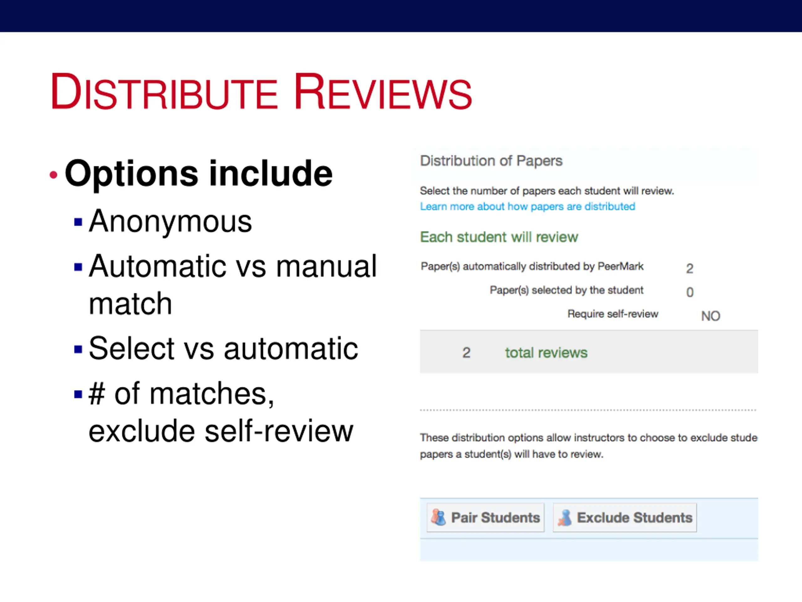 DISTRIBUTE REVIEWS Options include Anonymous Automatic vs manual match Select vs automatic # of matches, exclude self-review