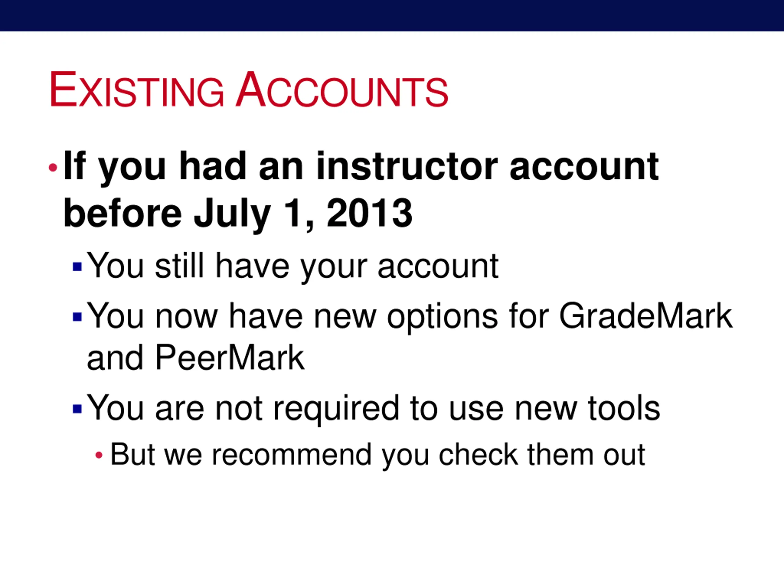 EXISTINGACCOUNTS If you had an instructor account before July 1, 2013 You still have your account You now have new options for GradeMark and PeerMark You are not required to use new tools But we recommend you check them out