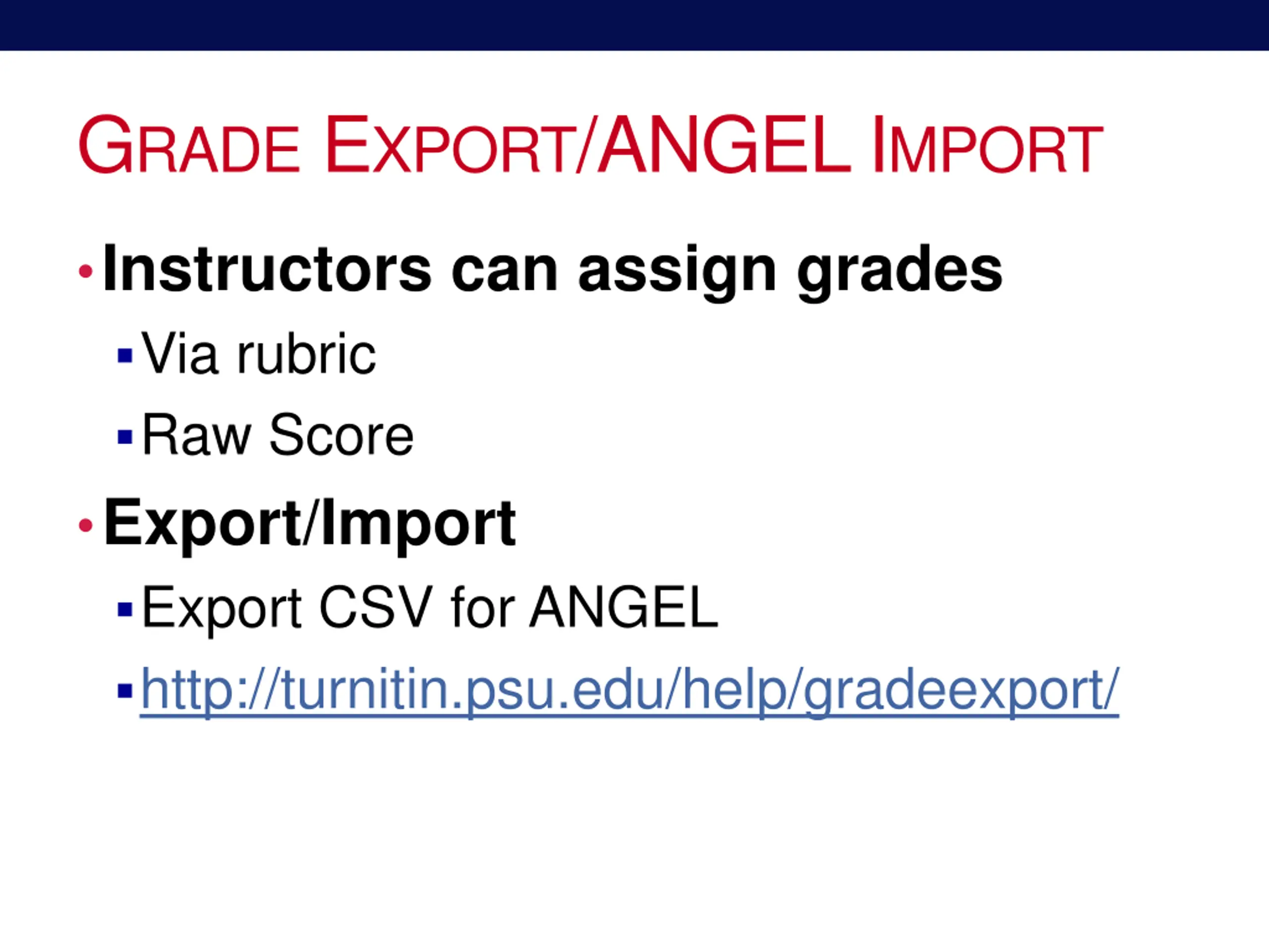 GRADE EXPORT/ANGEL IMPORT Instructors can assign grades Via rubric Raw Score Export/Import Export CSV for ANGEL http://turnitin.psu.edu/help/gradeexport/