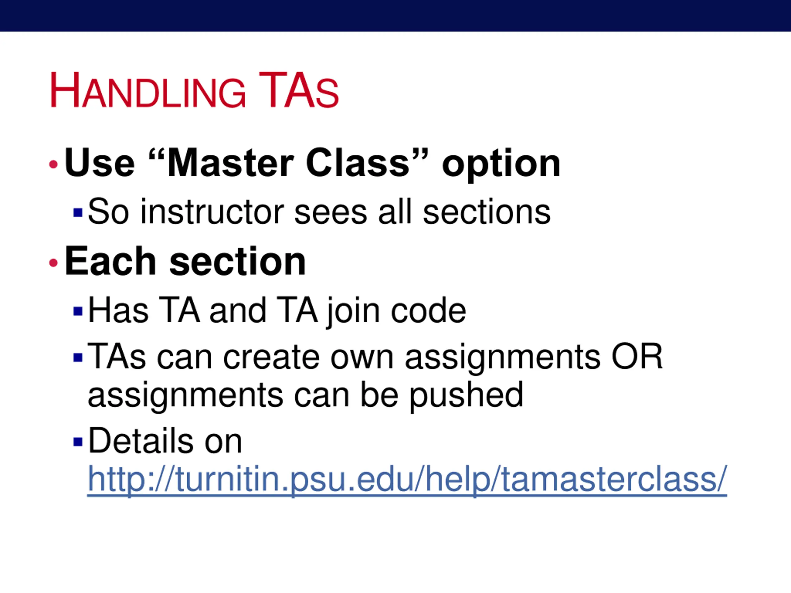 HANDLING TAS Use Master Class option So instructor sees all sections Each section Has TA and TA join code TAs can create own assignments OR assignments can be pushed Details on http://turnitin.psu.edu/help/tamasterclass/